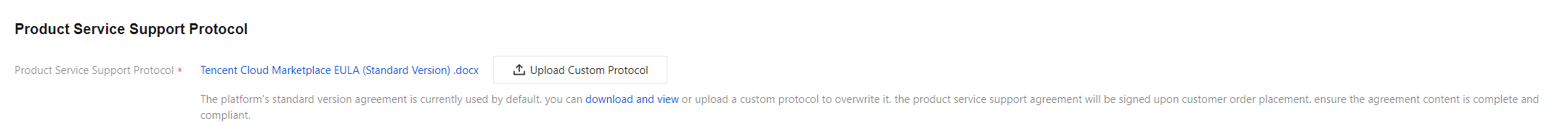 For products categorized as "Marketplace Products" with "online billing" as the payment method, the Platform Standard Agreement is currently applied by default, and partners are supported in uploading custom agreements. For other product types and billing models, upload agreements based on actual circumstances or use the platform-provided agreement templates. It is advisable to specify constraints regarding the scope of the software usage license and terms of service.