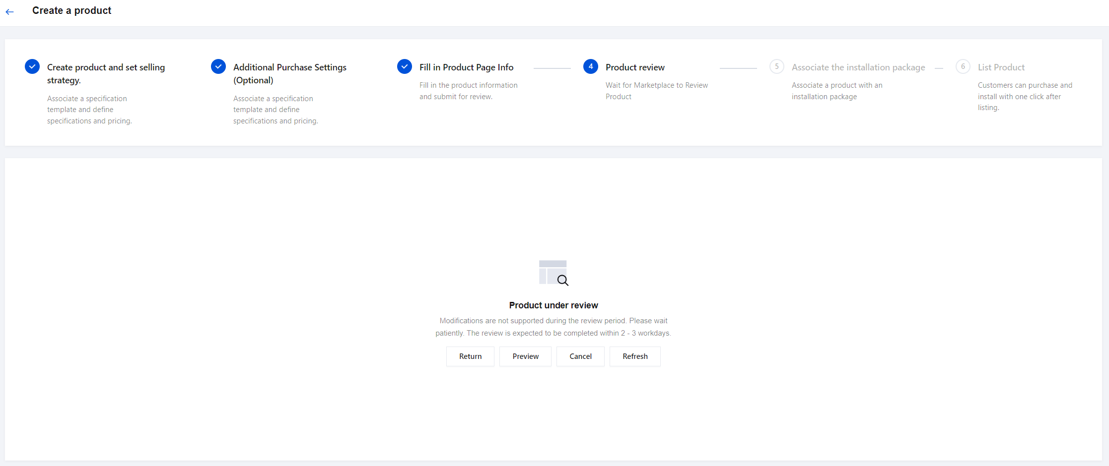 Step 4: Product review. | Waiting for Marketplace to review product information. | |