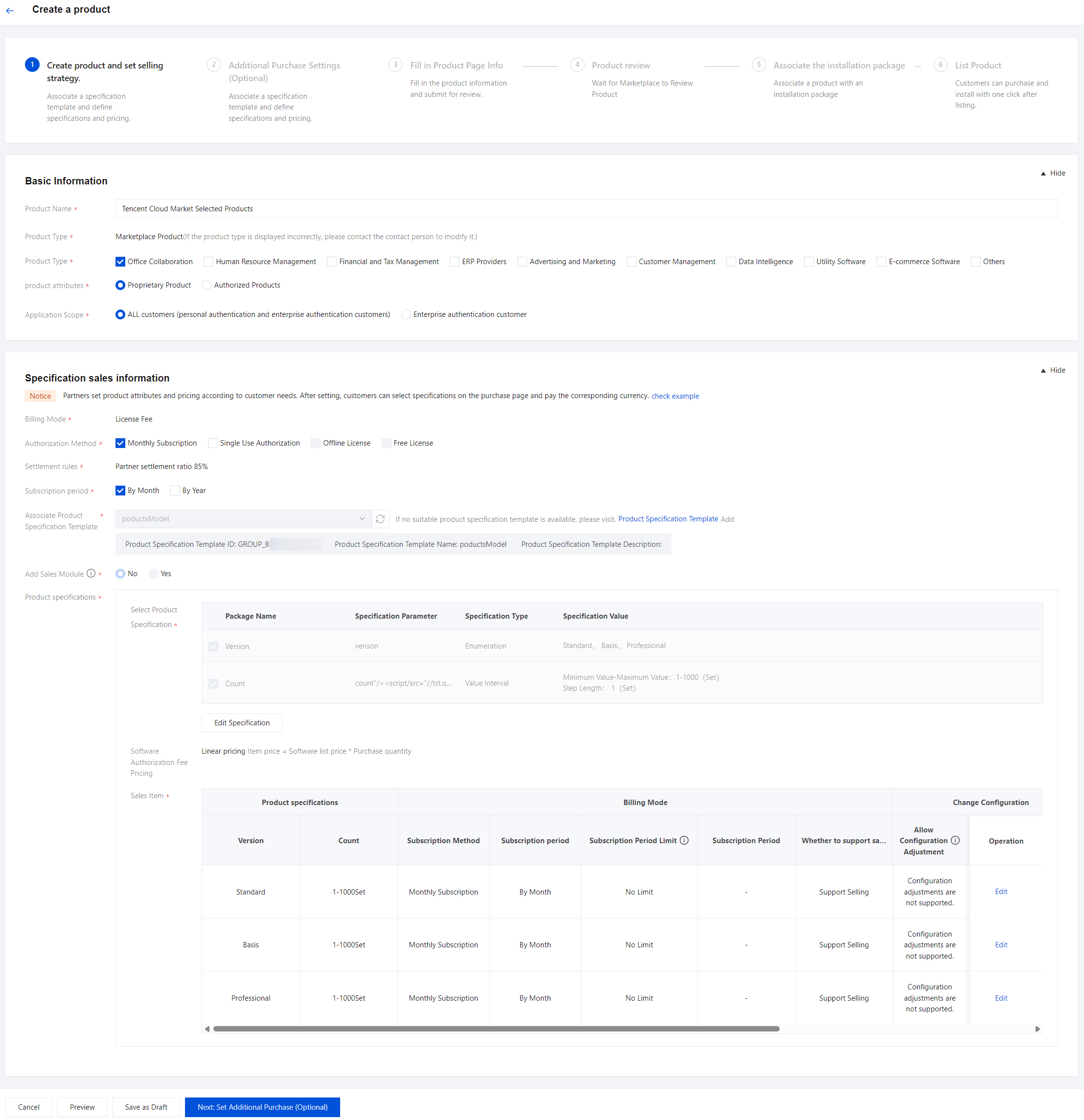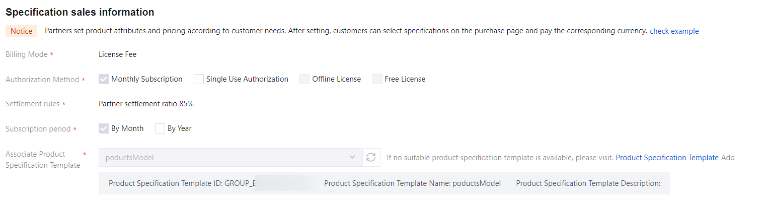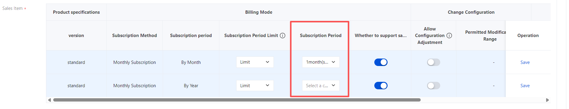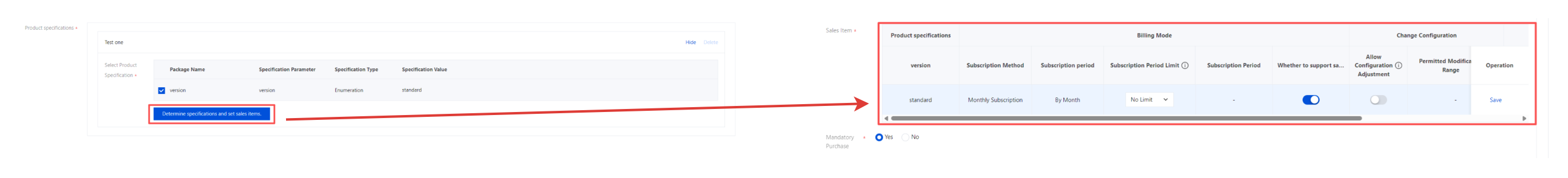 After the specifications are confirmed, the system will automatically compile a complete collection of sales items based on the subscription model, subscription cycle, and specification information.