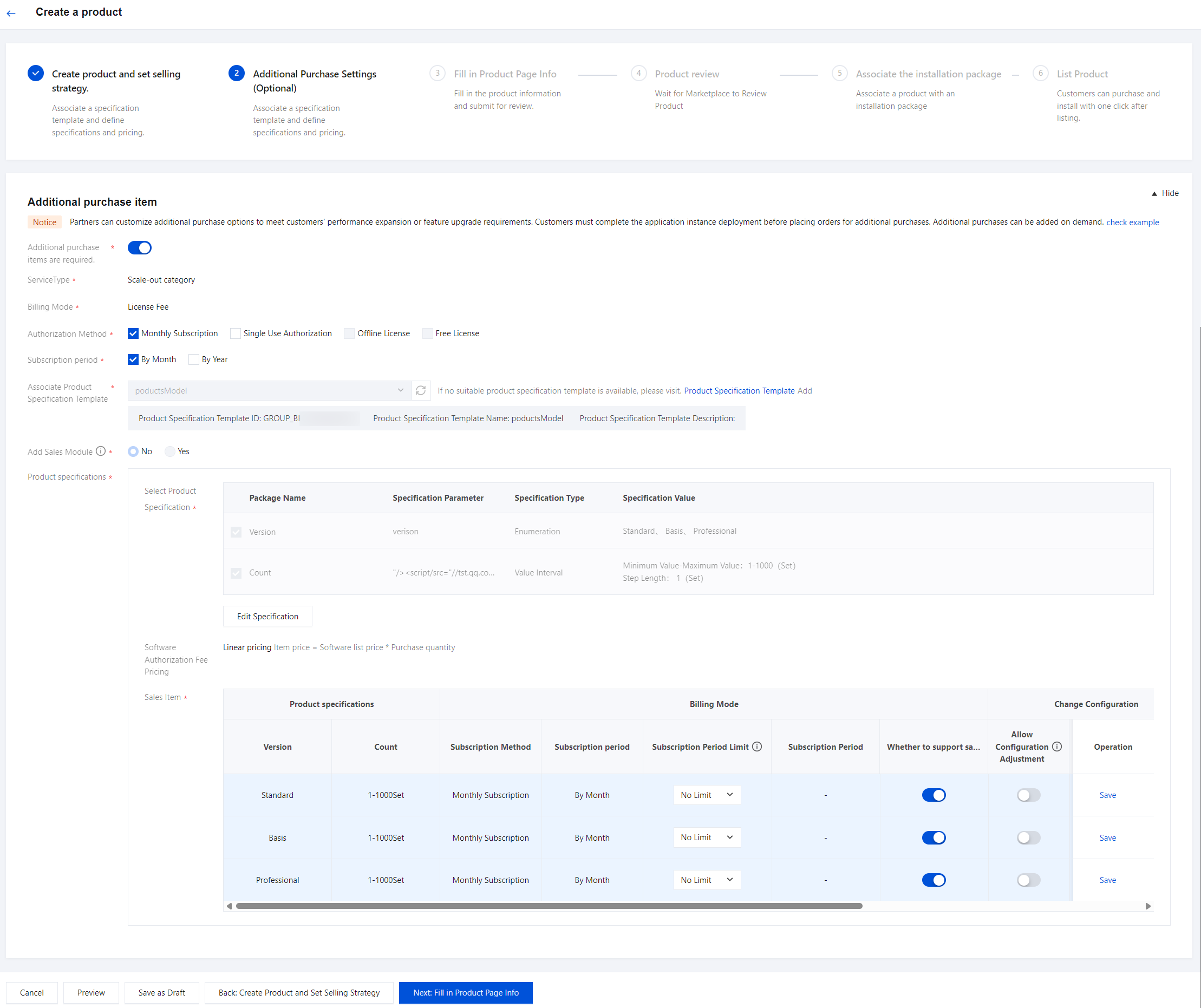 Step 2: Set up add-ons (optional). | Add scaling or feature upgrade services for products, and define the subscription period, pricing, and so on for sales items. | |
