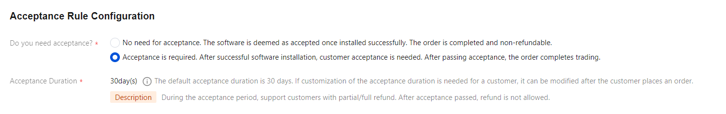 If acceptance is required for the product, the customer must manually confirm acceptance in the system (the customer manually operates in the system) after successful software installation. The default acceptance period is 30 days, and this duration cannot be modified during product listing.