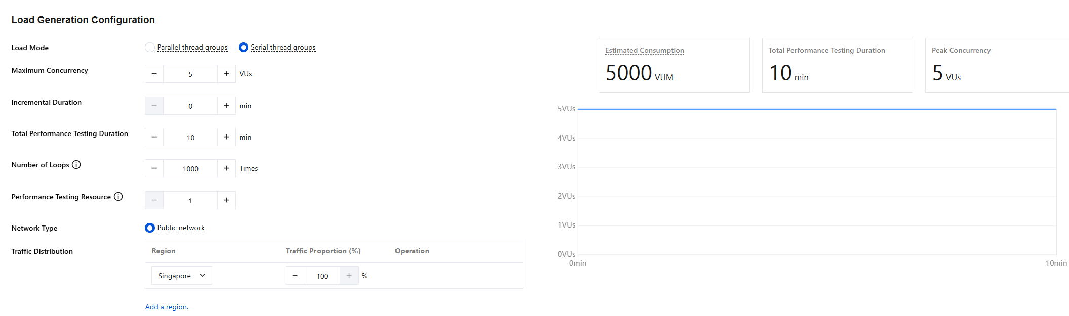 The concurrency configuration will be applied to each main thread group. In this case, the maximum concurrency for each main thread group are 1,000, the increment duration is 1 minute, the total performance testing duration is 10 minutes, and the number of loops is 1,000.