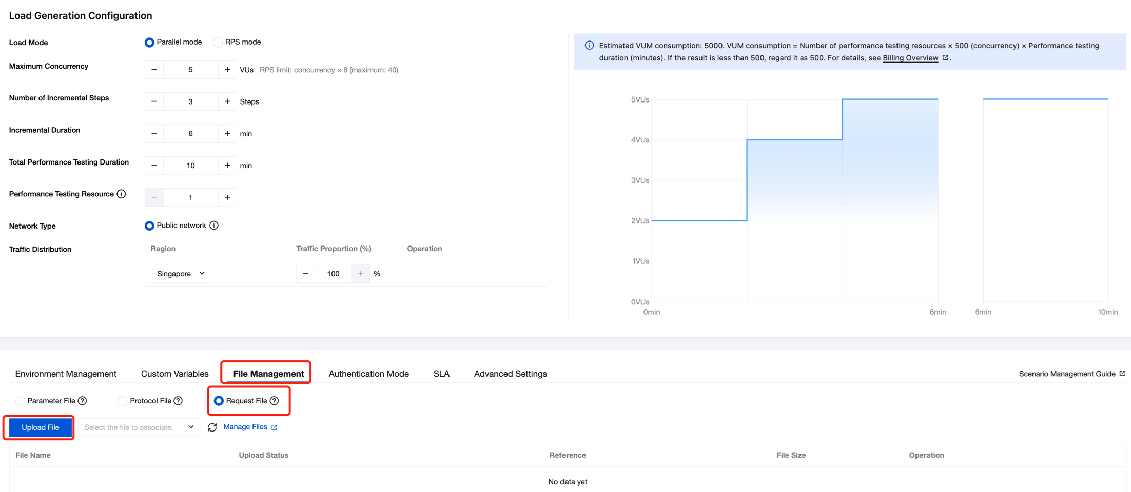 When you configure the RPS throttling parameter, PTS automatically adjusts the number of performance testing resources (1 resource = 500 VUs) to ensure the load generator can send the required number of requests per second.