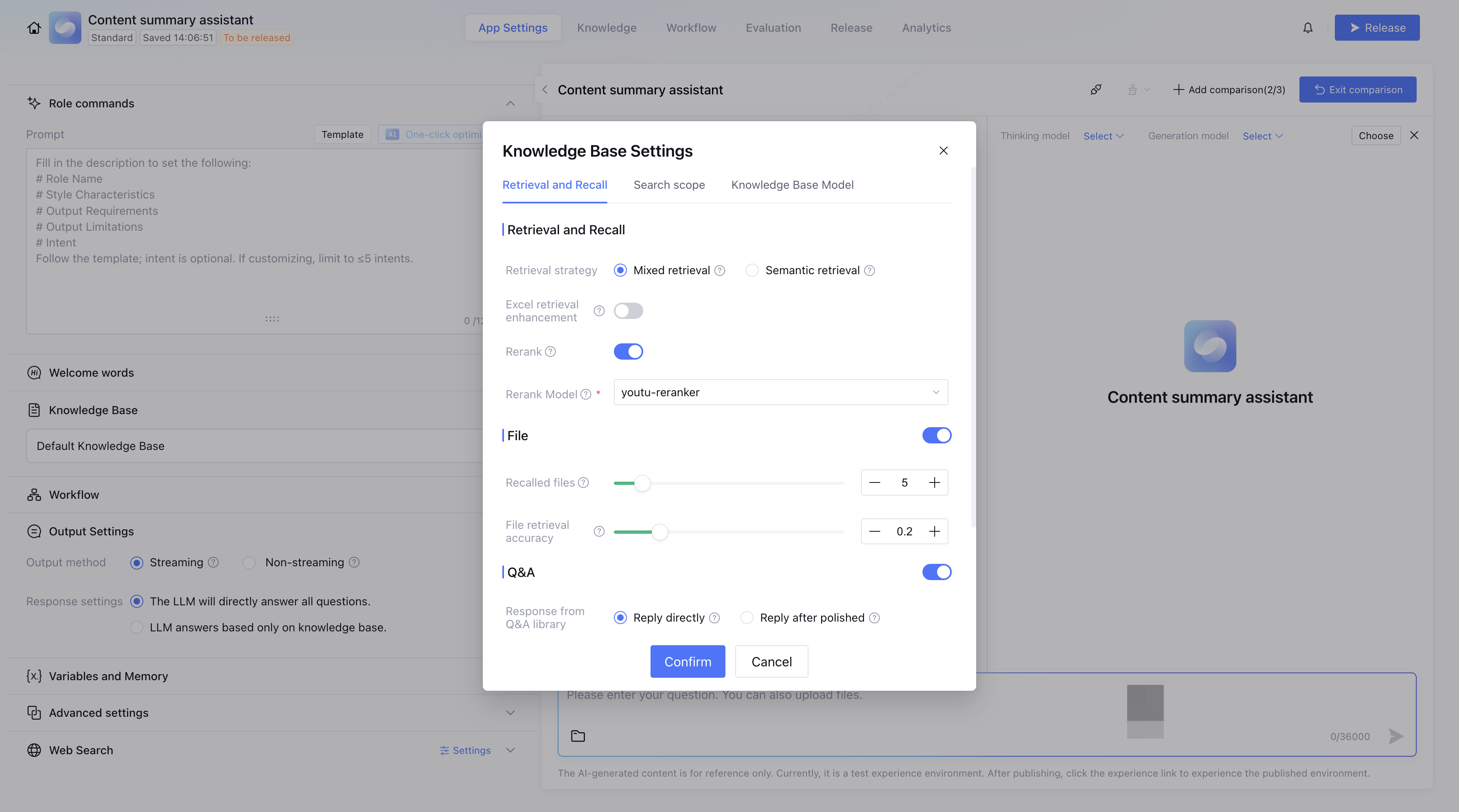 Reranking: When enabled, you can select a re-ranking model. After retrieval recall, the system reorders results by analyzing the user’s question, so that the most similar content is ranked first. The platform provides 2 preset reranking models, and you can also configure third-party re-ranking models via the Model Marketplace.