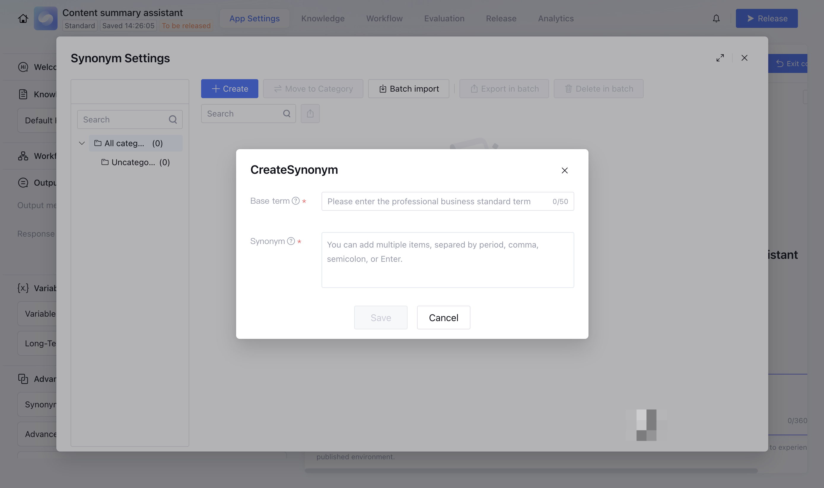 You can import domain-specific terminology for business scenarios. Synonyms in queries will be unified to the standardized terms in the knowledge base before retrieval, improving retrieval accuracy.