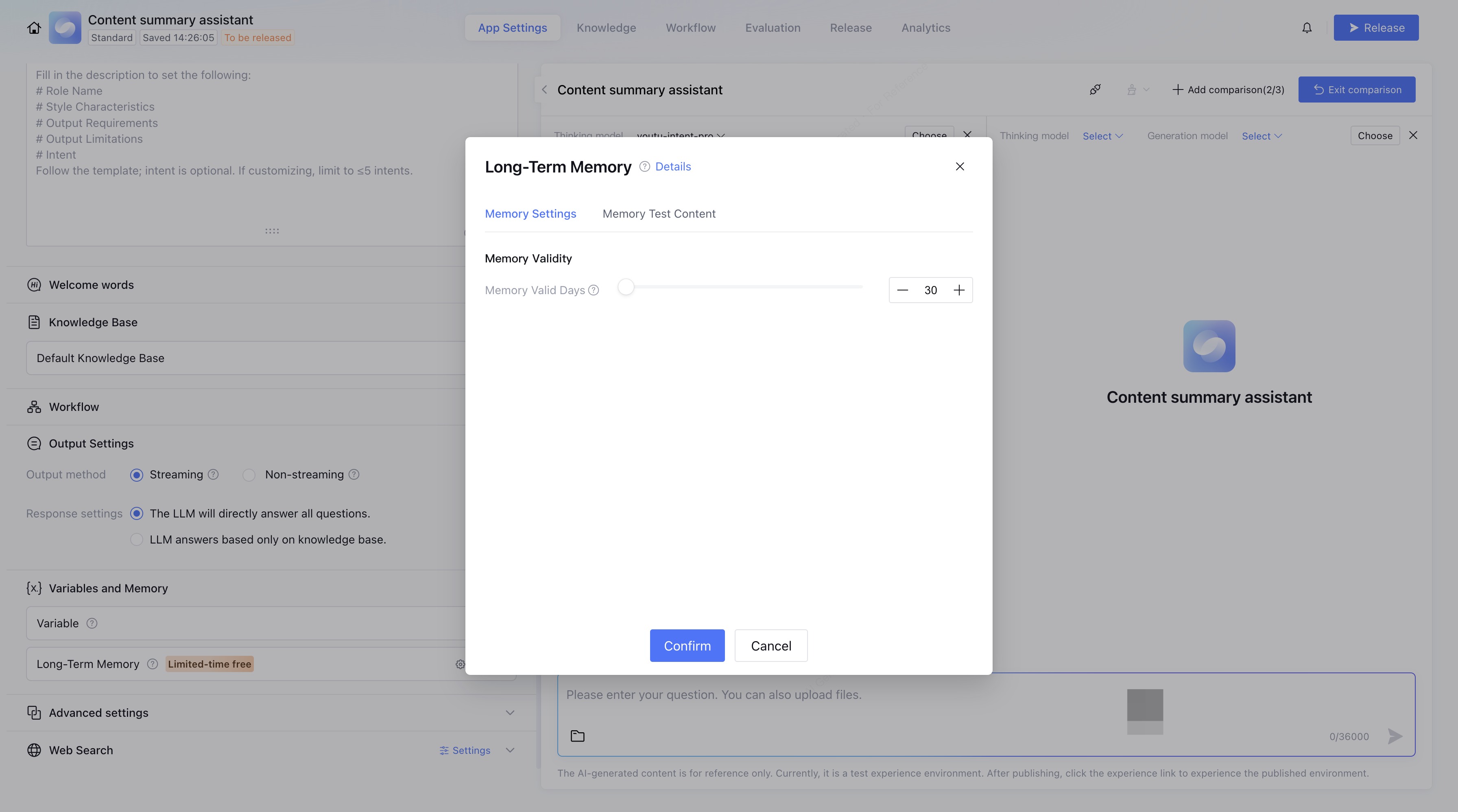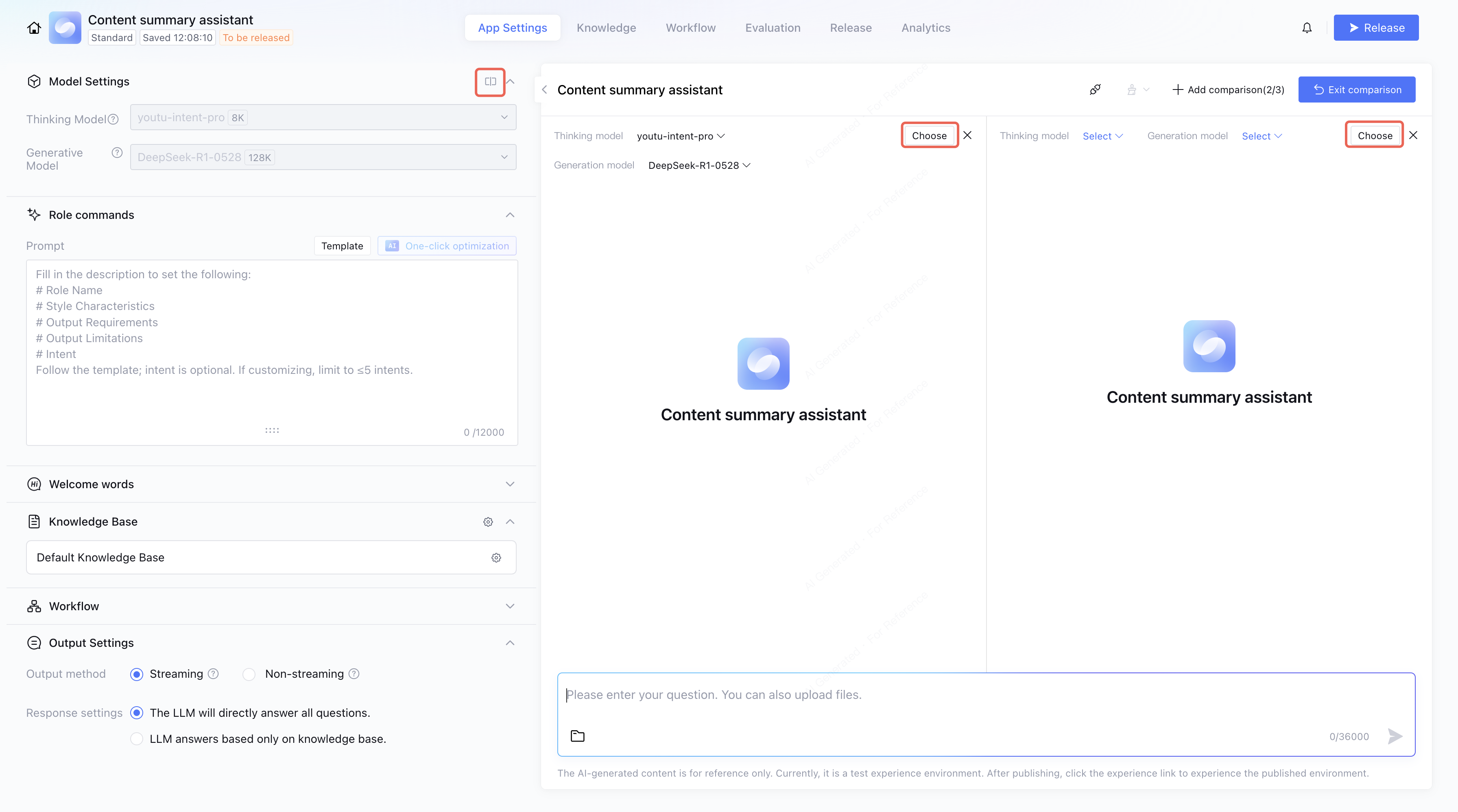 You can compare responses of different models to the same question, up to 3 models at the same time. Each model supports parameter tuning. If you find a better-performing model, click Choose to select it. The selected model will take effect after exiting the comparison and saving. If you choose to discard and exit, the selected model will not take effect.
