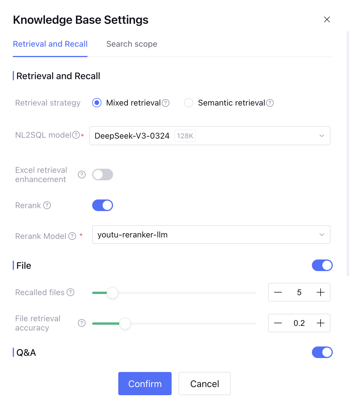 QA retrieval match rate: based on settings, the found Q&A content will be returned to the large model as reference for reply. A lower value means more fragments are recalled, but may affect accuracy. Content with a match rate less than the set value will not be recalled.