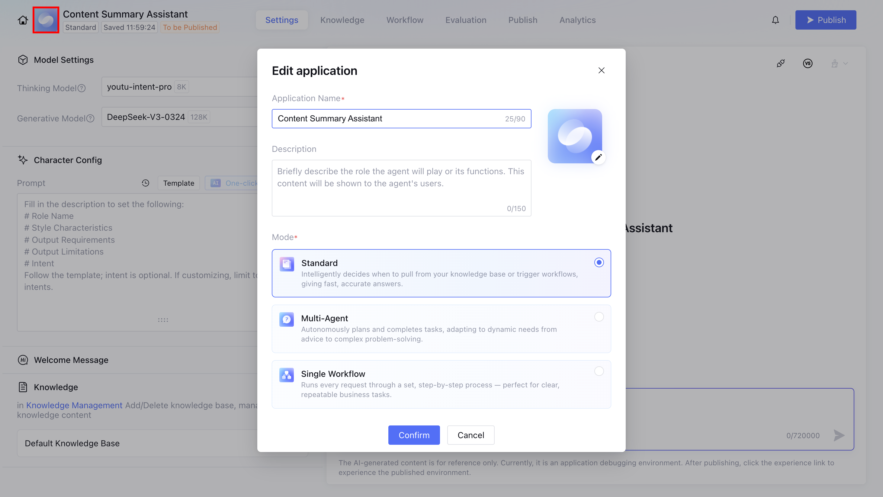 After creating the application, click the app icon in the upper left corner. You can modify basic information such as the app icon, application name, and application description in the Edit application pop-up window, and perform application mode switchover. For details about each mode, see Agent Application and Its Three Modes. After the settings are completed, the settings page will have differences based on the application mode. Reference the following table:
