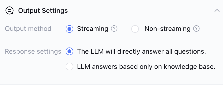 Output method: Supports choosing whether answers are output in streaming form (character-by-character) or non-streaming form (output all at once after generation).