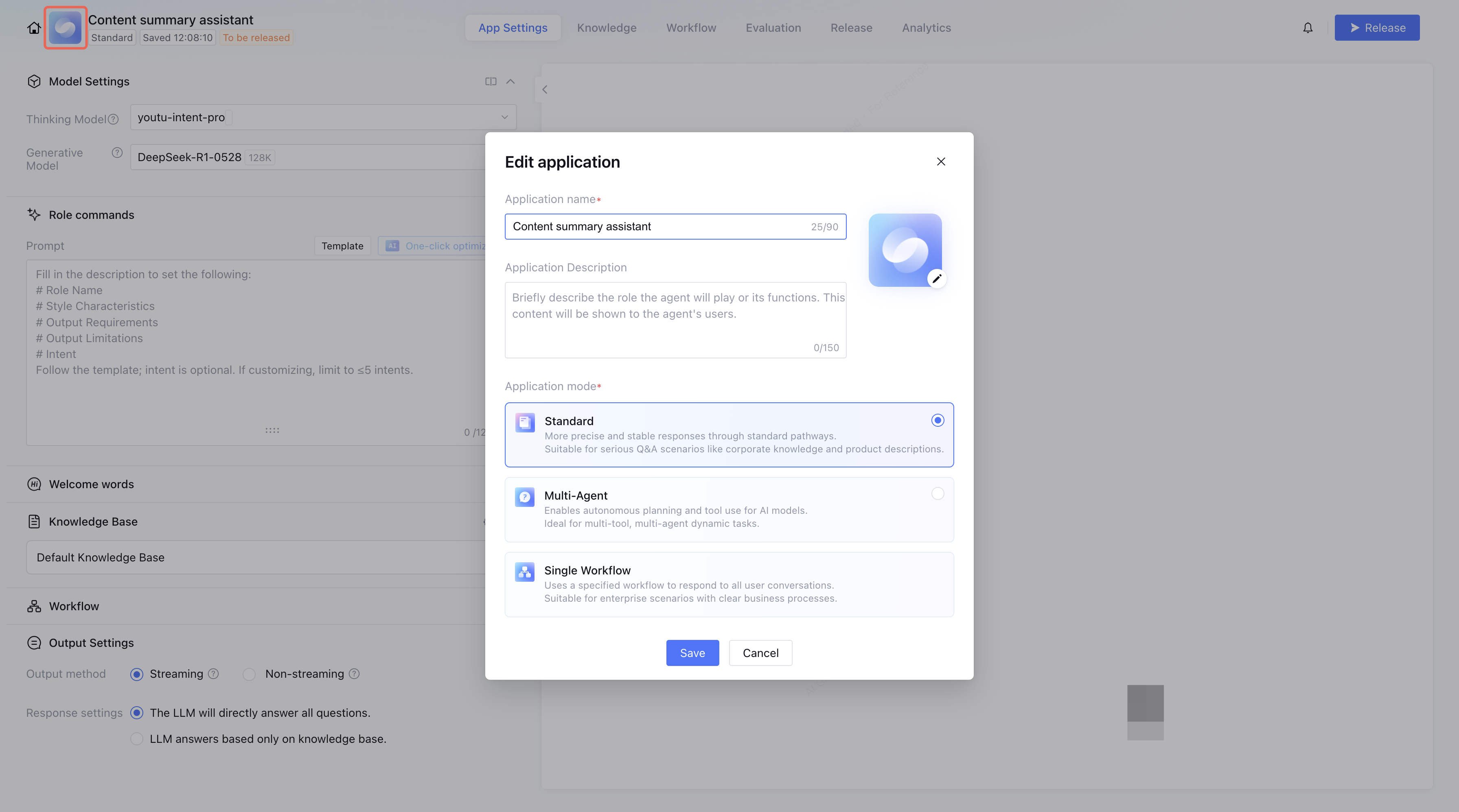 After creating an application, enter the App Settings Page to set the application model, knowledge base, and output. This document uses the standard mode application as an example to introduce App Settings in detail.