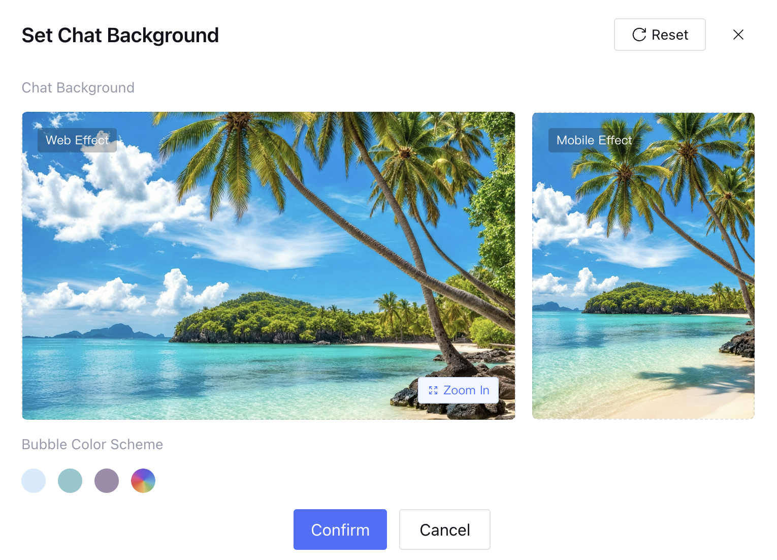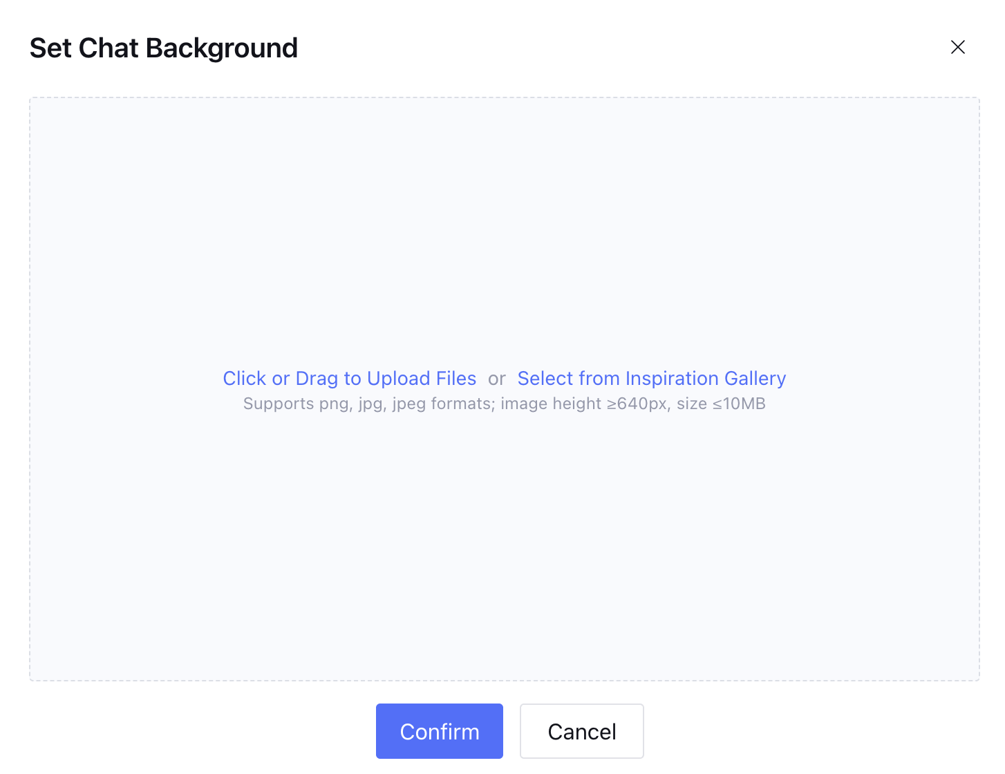 Support setting background styles for the chat interface. After clicking the set button, you can upload a custom background image, support uploading local files or selecting from the image library.