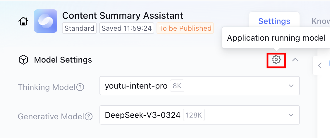 After creating an application, enter the Application Settings Page to configure the application model, knowledge base, and output configuration. This document uses the standard mode application as an example to introduce application configuration in detail.