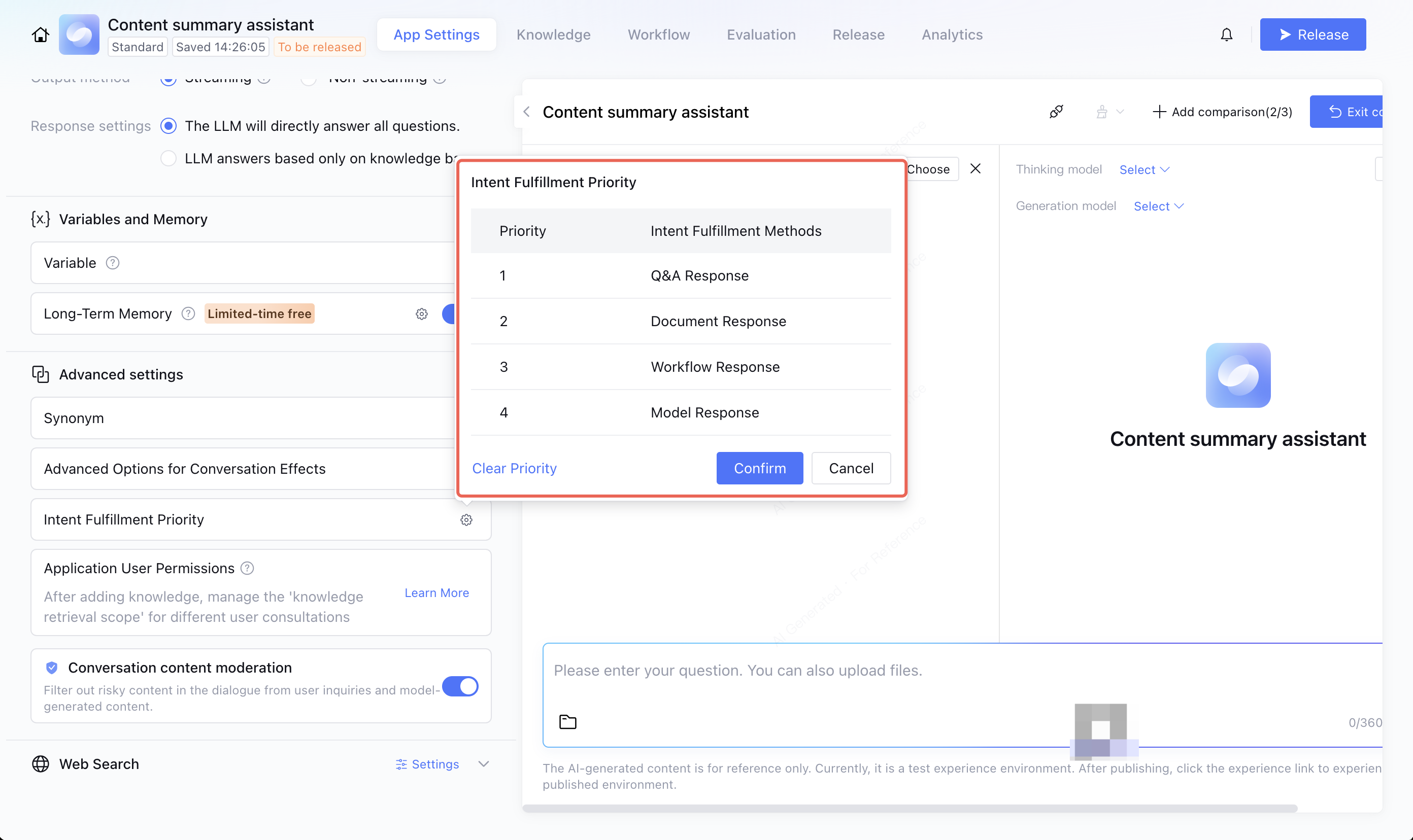 If there is high similarity between your Q&A and workflow settings, it may affect the model’s accuracy in determining which to call. In this case, you can set reasonable priorities.