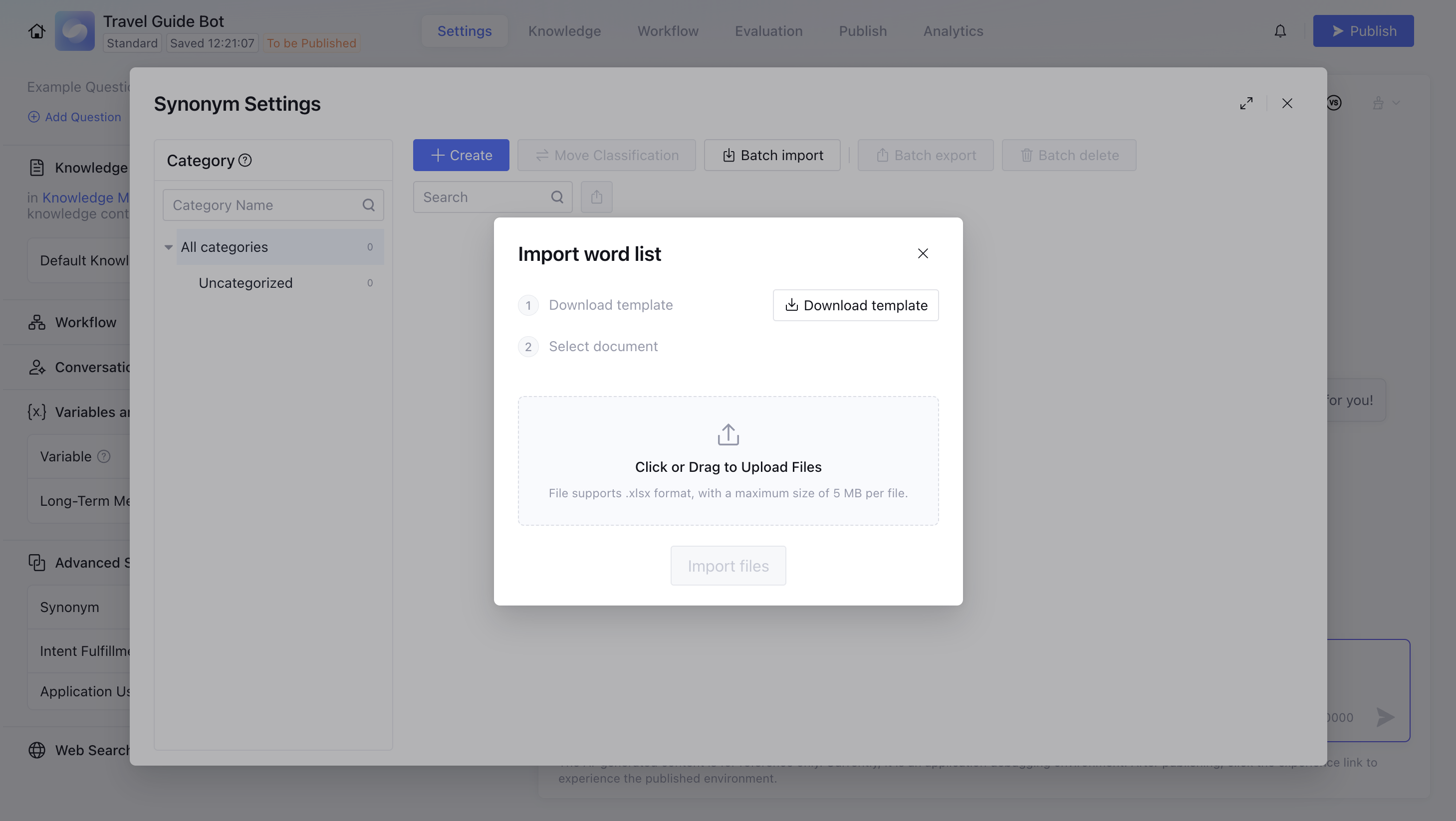 Knowledge base: Under the same root account, flexible association between knowledge bases and applications is supported. A knowledge base can be shared by multiple applications, and an application can also refer to multiple knowledge bases. You can create and maintain knowledge bases in "Knowledge Base" and refer to them for usage in knowledge management under applications.