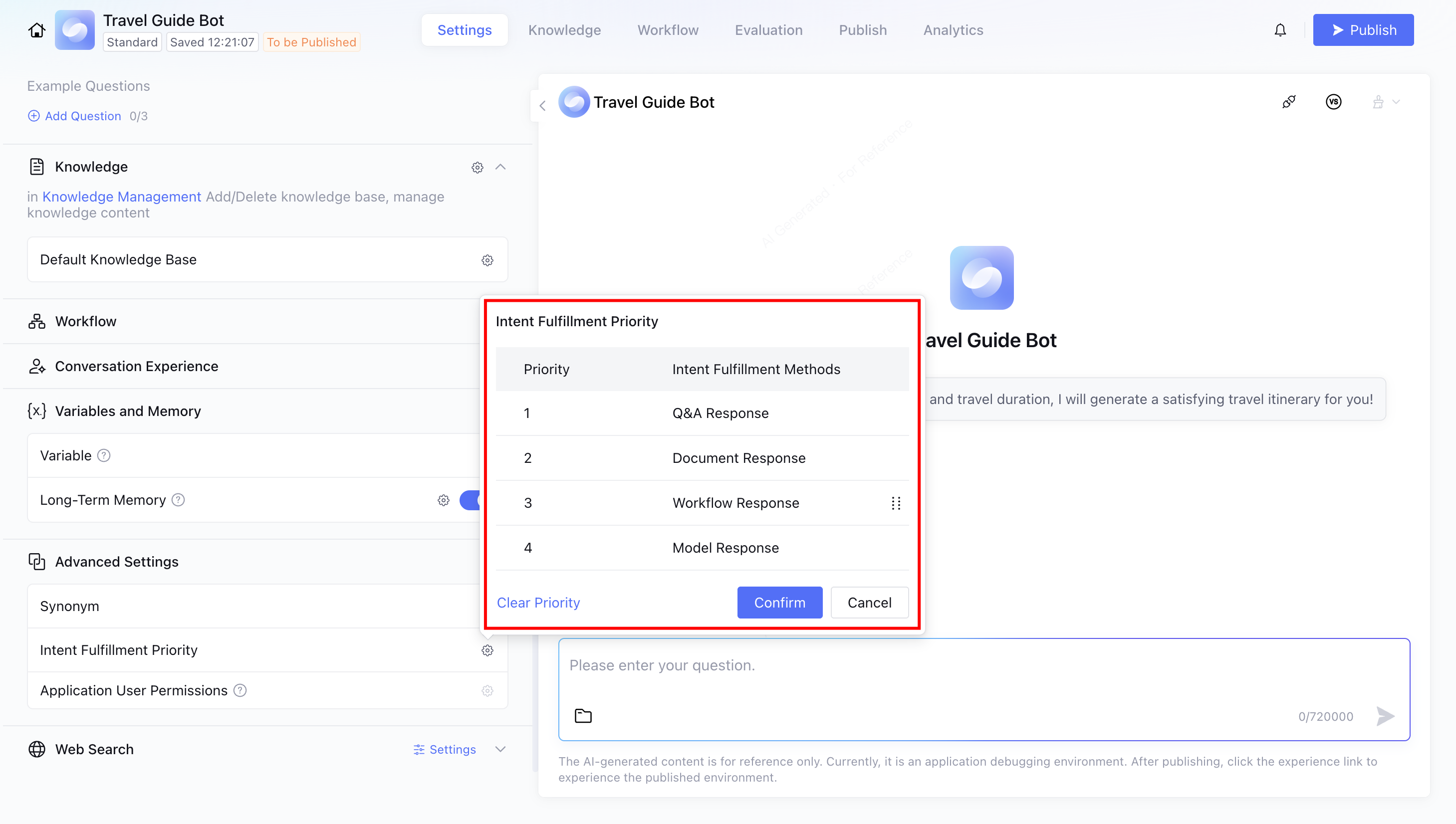If the QA and workflow in your platform setting are highly similar, it may affect the accuracy of the large model's judgment regarding API call methods. At this point, you can set a reasonable priority.