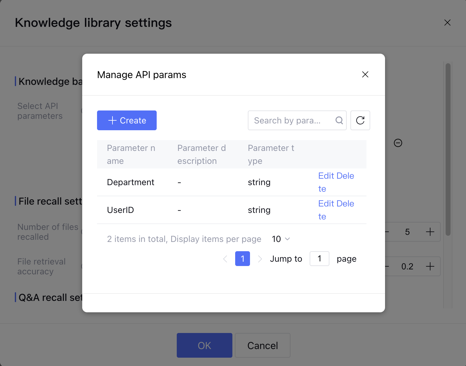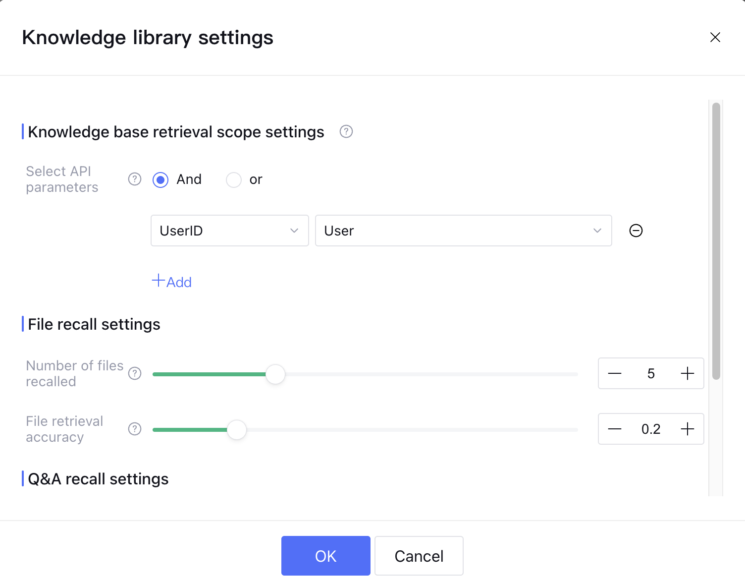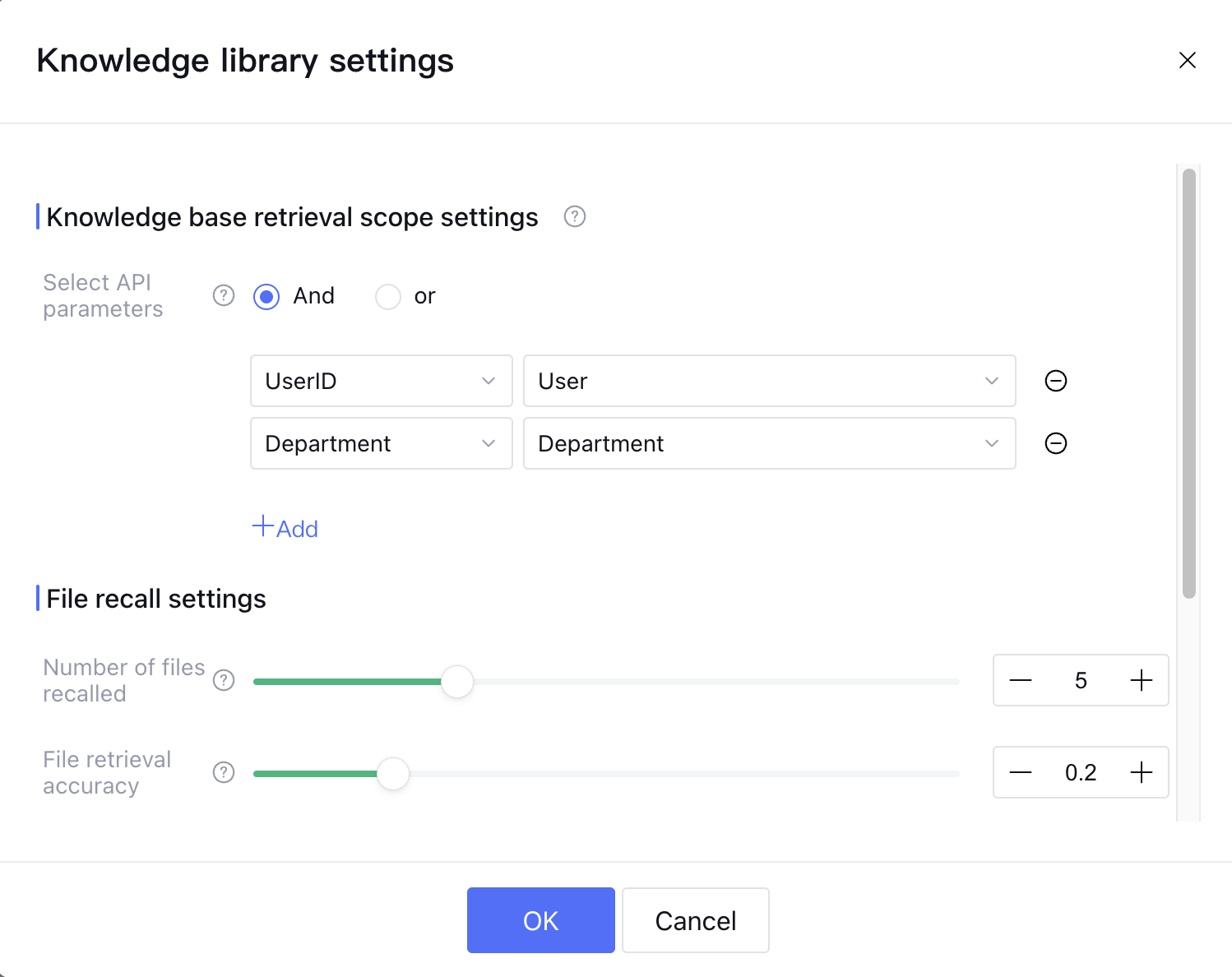 In Knowledge Management > Knowledge Base Settings > Knowledge Base Retrieval Scope Settings, set the API parameter to "AND", with API parameter name "UserID", mapped tag name "User Identity"; API parameter name "Department", mapped tag name "Department".