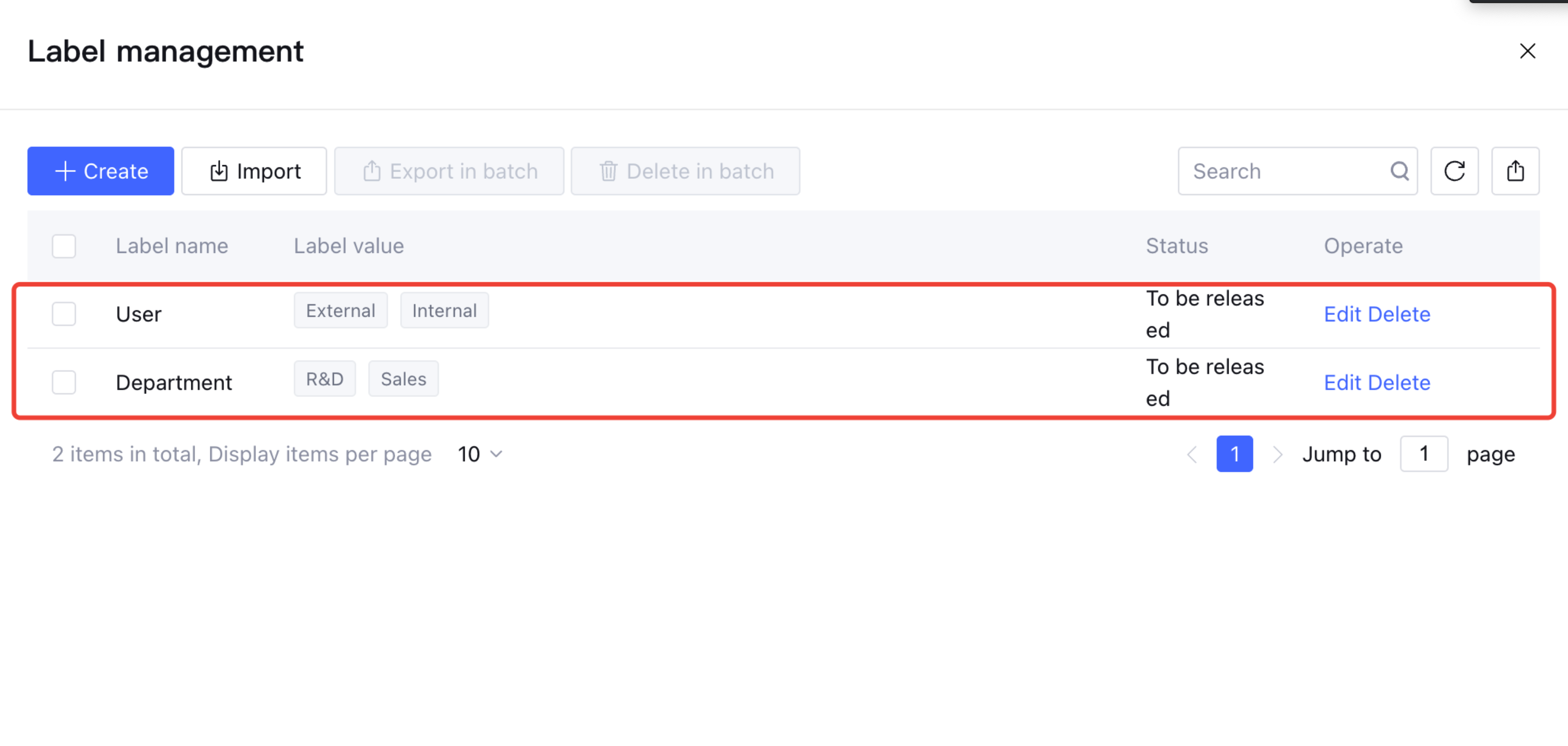 Enter the label management feature from the document/QA label. Create two label names: "User" and "Department". The standard words for user identity include external user and internal employee; the departments include R&D Departmentand Sales Department.