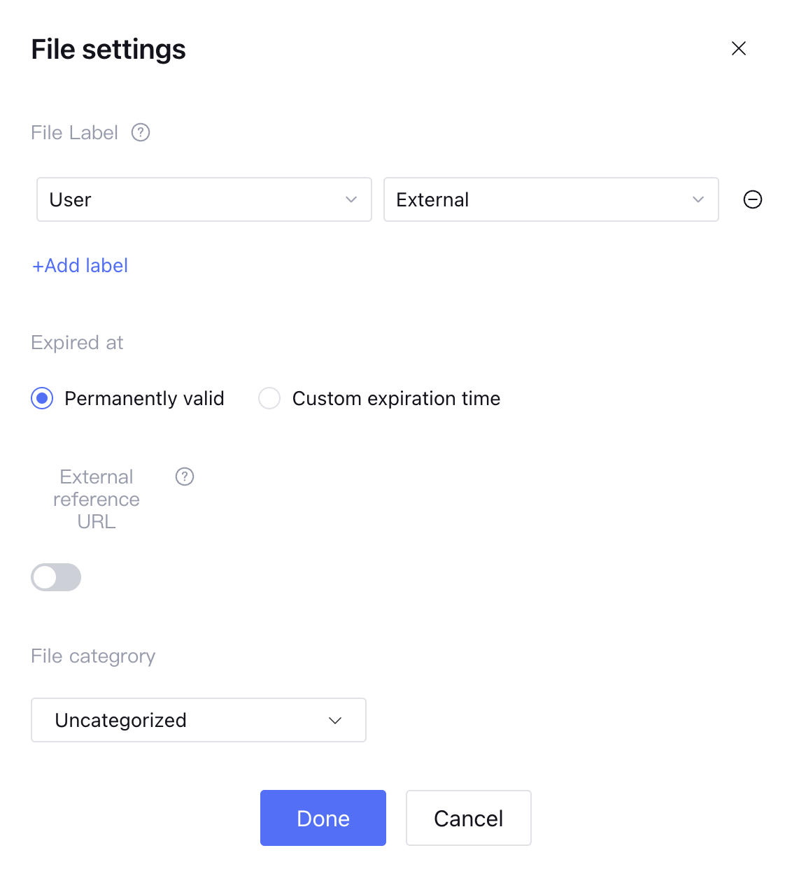 1. Documents visible to external users. Select "Label Name = User" and "Label Value = External" in the file label; no need to set the department label.