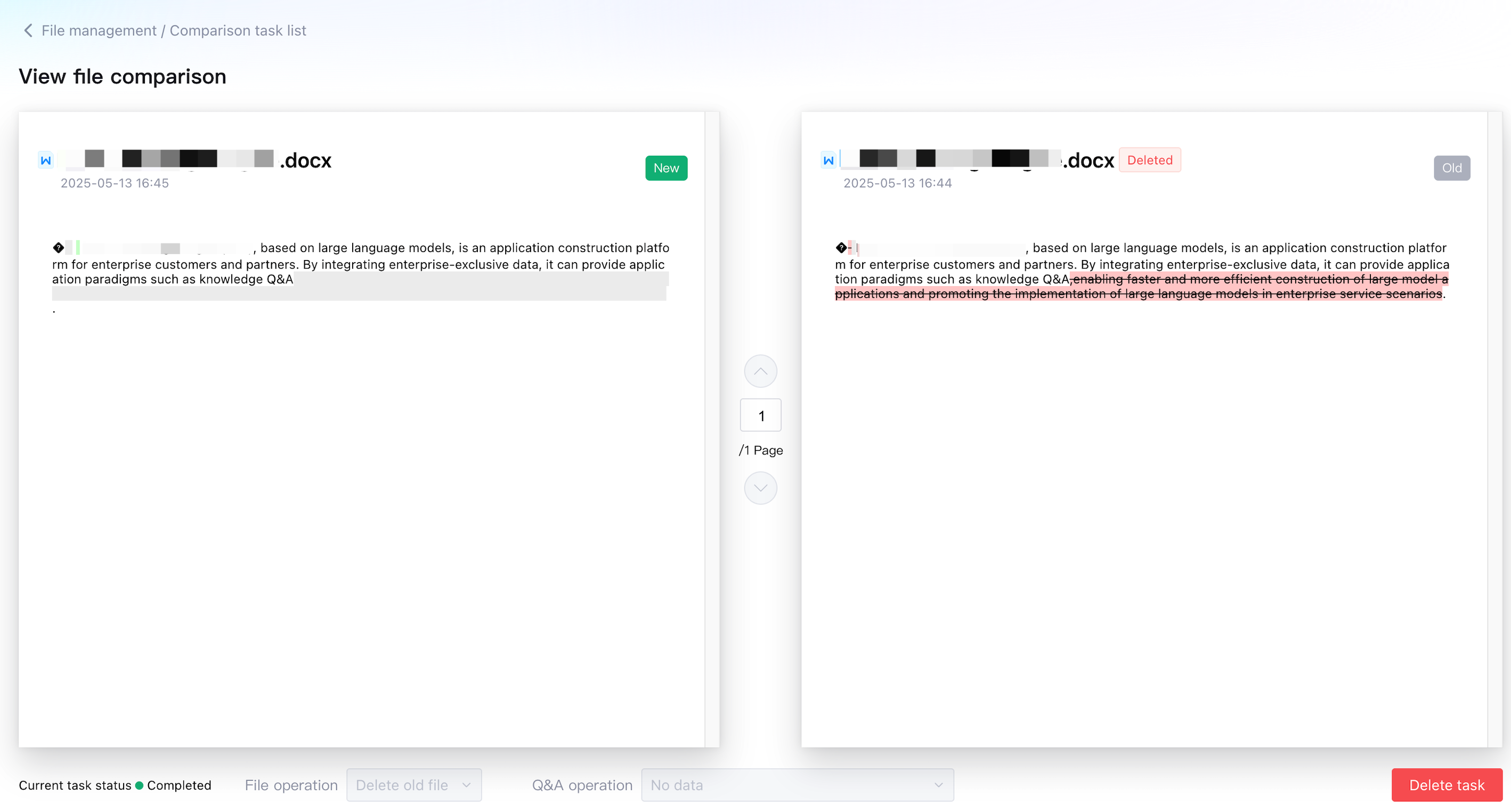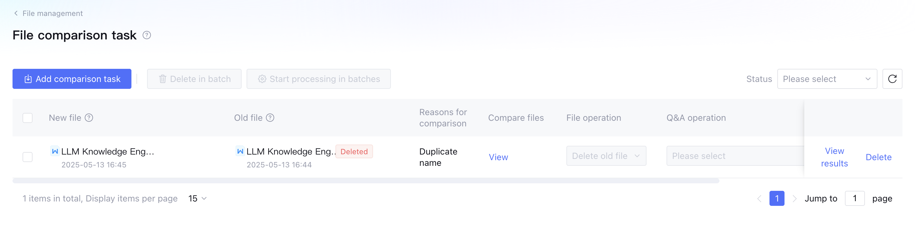 The file comparison task is used to compare the differences between two files, such as file names, file contents, and Q&A pairs generated from file. It assists customers in handling duplicate or similar content in the knowledge base and guarantees the effect of knowledge Q&A.