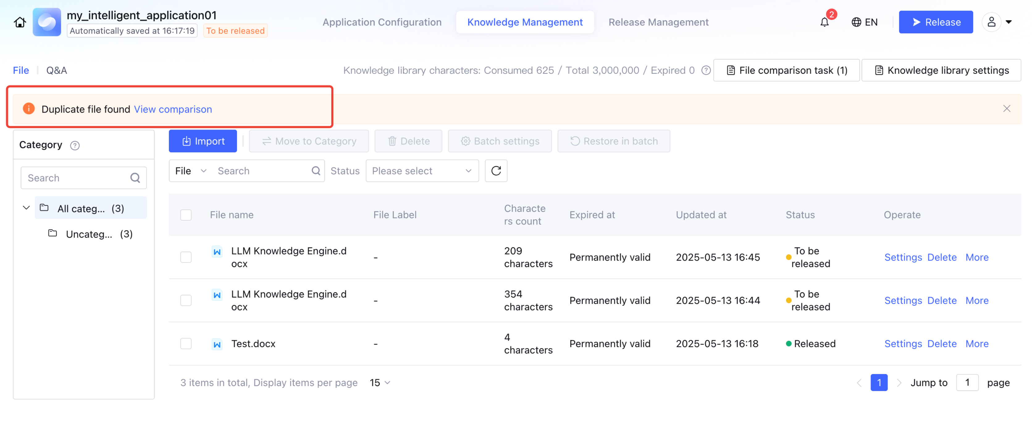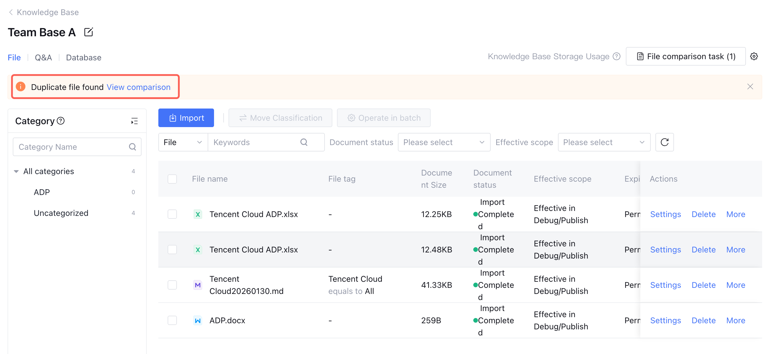 Upload a file with the same name will automatically trigger a comparison task. The operator can delete the old file and its Q&A pairs through the comparison task.