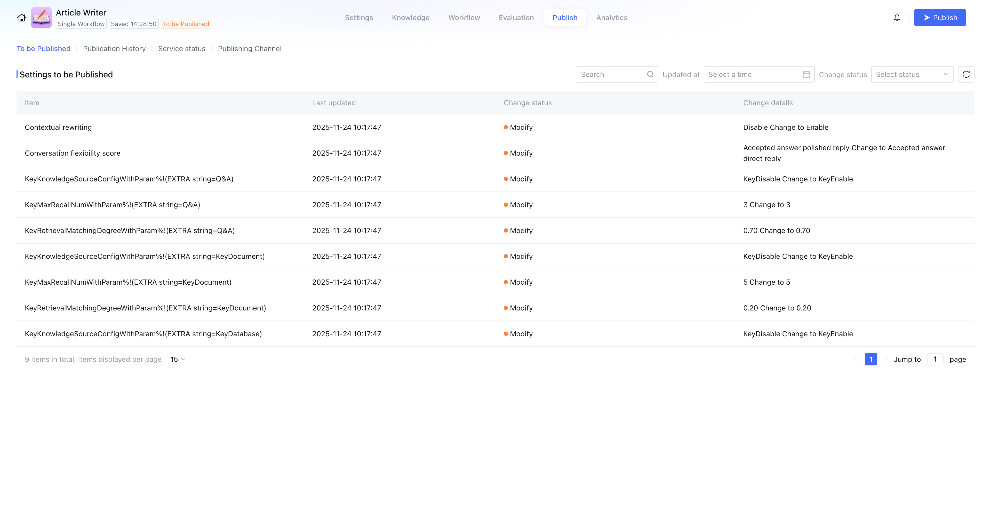 When you complete application configuration, knowledge base import, and effectiveness verification in a test environment, you can use the application publish feature to synchronize current application configuration, knowledge base content, etc. to the official environment in one-time and provide external services. You can view the historical modification record of Intelligent Agent applications here.