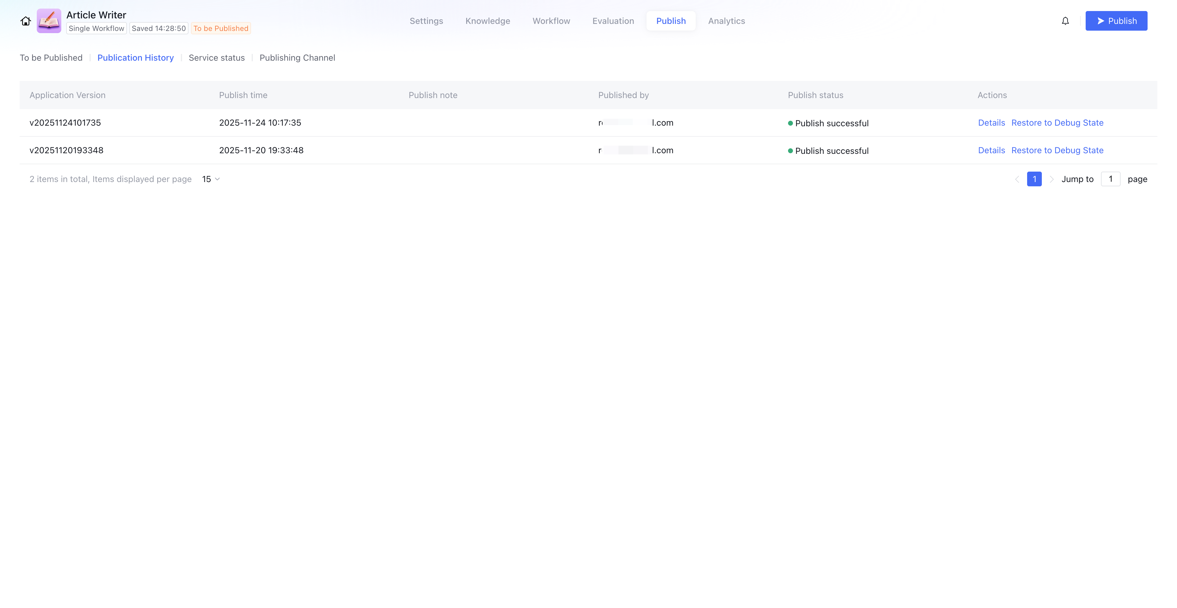 3. Click Publish to start the release process. After publishing, you will receive a message center notification. You can also check the details of this release in Publish > Publication History. After publishing, the system will automatically generate a unique version number. You can view other version numbers on the publication history page.