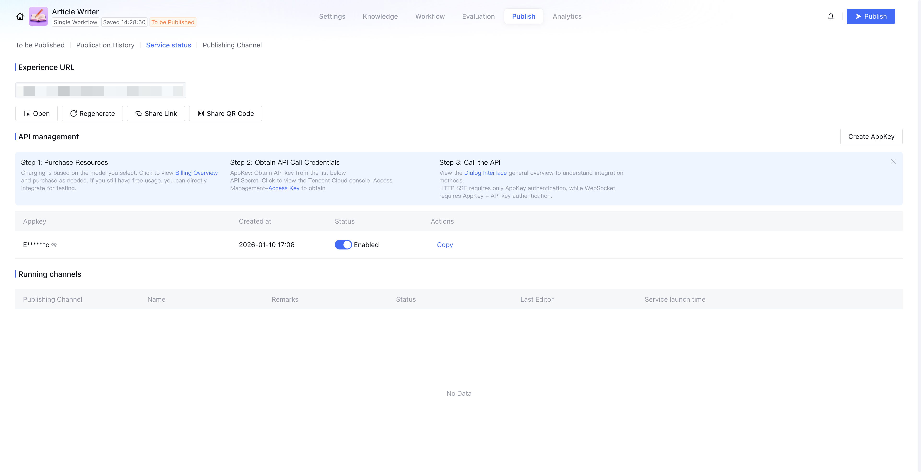 After a successful release, go to the Service status tab to obtain the Experience Link for direct testing or the appkey for API management.