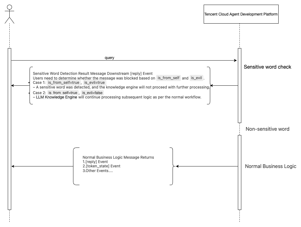 is_evil | bool | whether it hits sensitive content Note: After message uplink, sensitive content detection is first performed, and a [reply] event is returned to inform the sensitive content detection result. Normal business logic processing starts only after sensitive content detection is passed. ![]() |