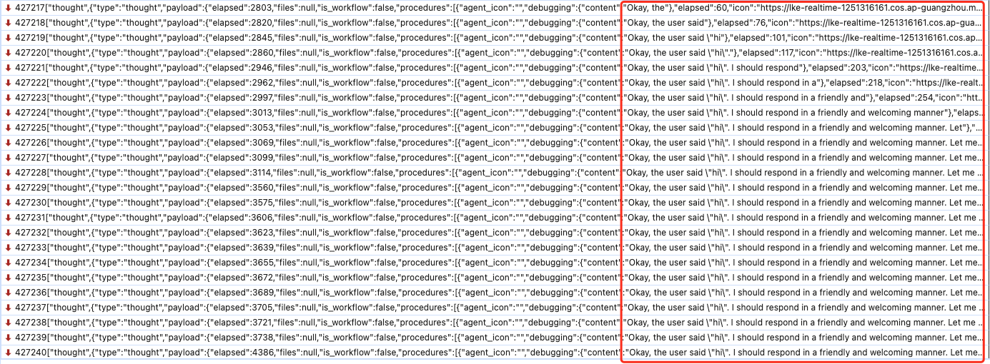 ["thought",{"type": "thought","payload": {"elapsed": 0,"is_workflow": false,"procedures": [{"debugging": {"content": "\\nOK, the user is asking about the features of DeepSeek-R1, and this is already the third time. The previous two times, I have already listed its high efficiency, long-context processing, versatility across multiple fields, security compliance, multilingual support, flexible deployment, and cost-effectiveness in detail. The user might be confirming the information or hoping for a more concise or different perspective in the response.\\n\\nI need to consider why the user is repeating the question. Possible situations include: the user did not fully understand the previous answer and needs a simpler summary; or they want to confirm the accuracy of the information; or they want to know if there are any new updates. In addition, the user might be testing the consistency of the responses, or they need the information for specific scenarios, such as reports or comparing different models.\\n\\nNext, I should check if the previous answers were comprehensive and if any important features were missed. For example, whether the training data, supported frameworks, or specific performance metrics were mentioned. Additionally, the user might be interested in technical details, such as the model structure, training methods, or practical applications."},"elapsed": 9954,"icon": "https://lke-realtime-1251316161.cos.ap-guangzhou.myqcloud.com/icon/thinking.png","index": 0,"name": "thought","plugin_type": 0,"status": "processing","switch": "","title": "Think""workflow_name": ""}],"record_id": "piQ_20250208_140511_254_45ja7HPq","request_id": "rjbuFuYeDB-8487350785","session_id": "dfd04cd0-ef69-4fb6-a447-a0b44018a93f","trace_id": "9a9613dbaa9edd27958bd1180c524295 / piQ_20250208_140511_254_45ja7HPq","workflow_name": ""},"message_id": "7070ef0d-4c28-4d5a-abc8-2ea2e7fa027d"}]