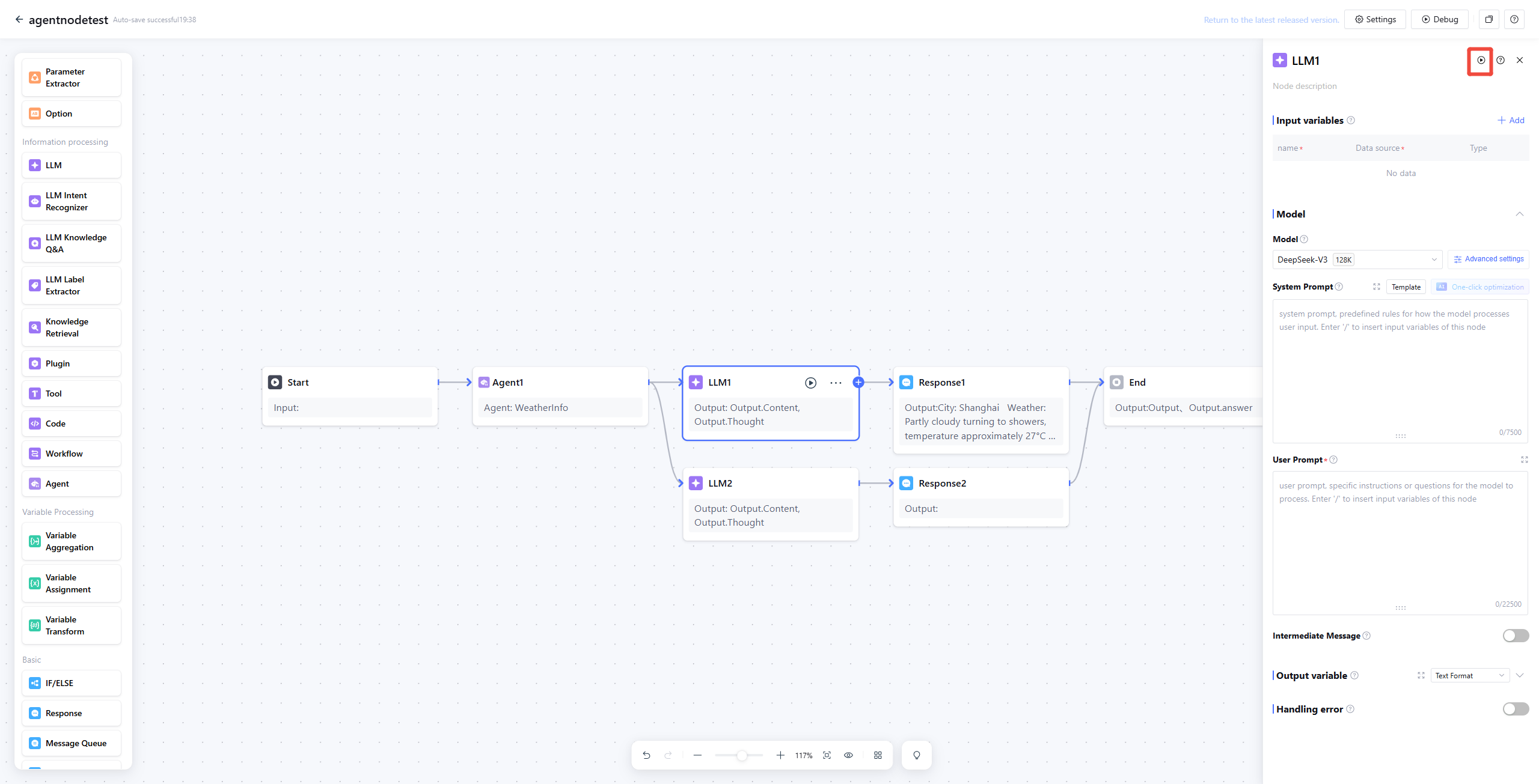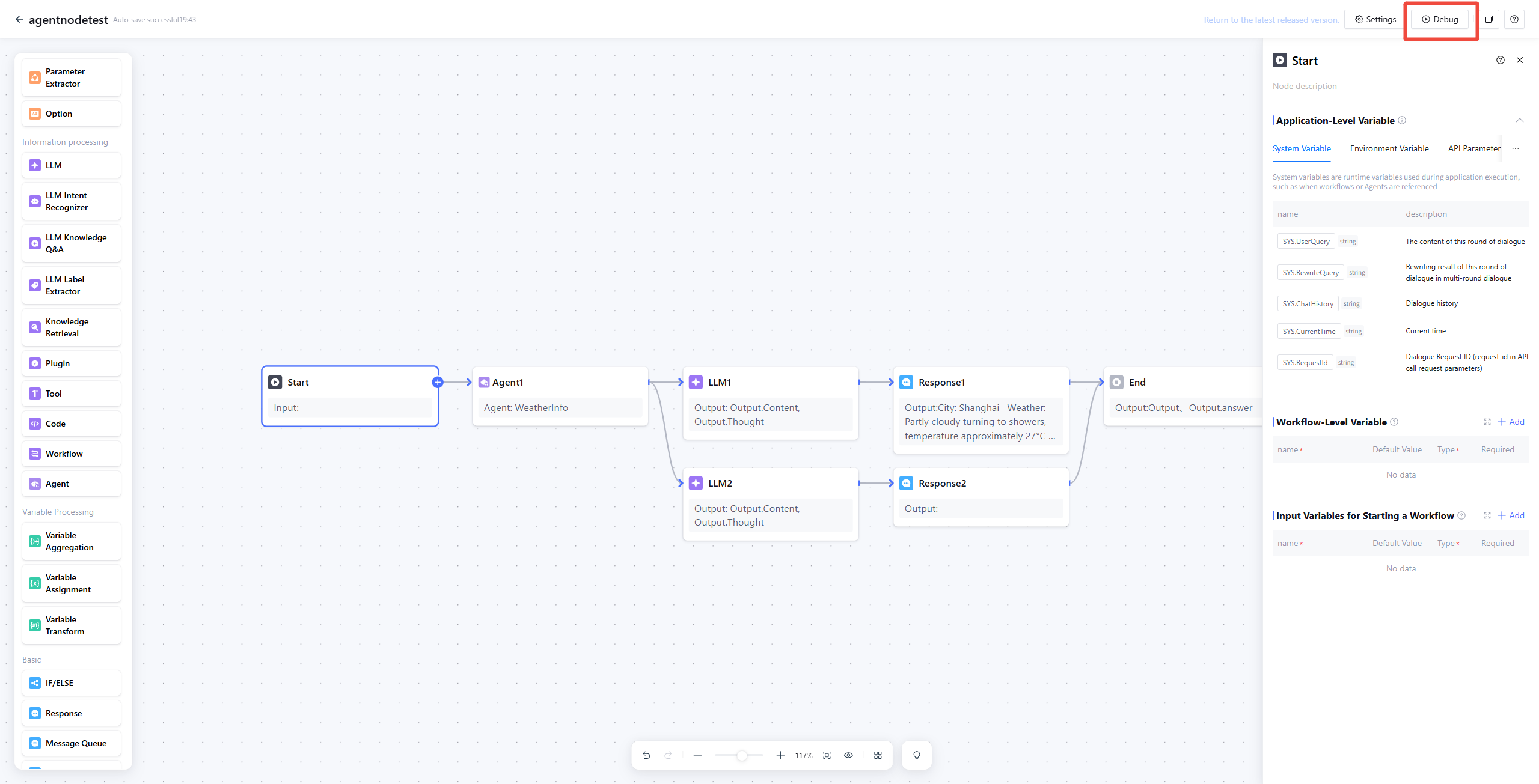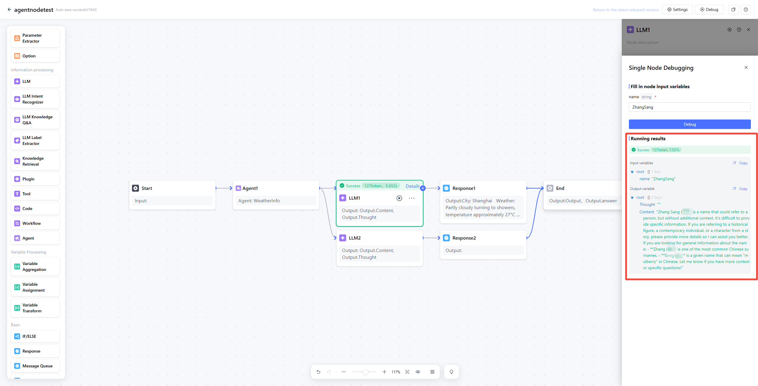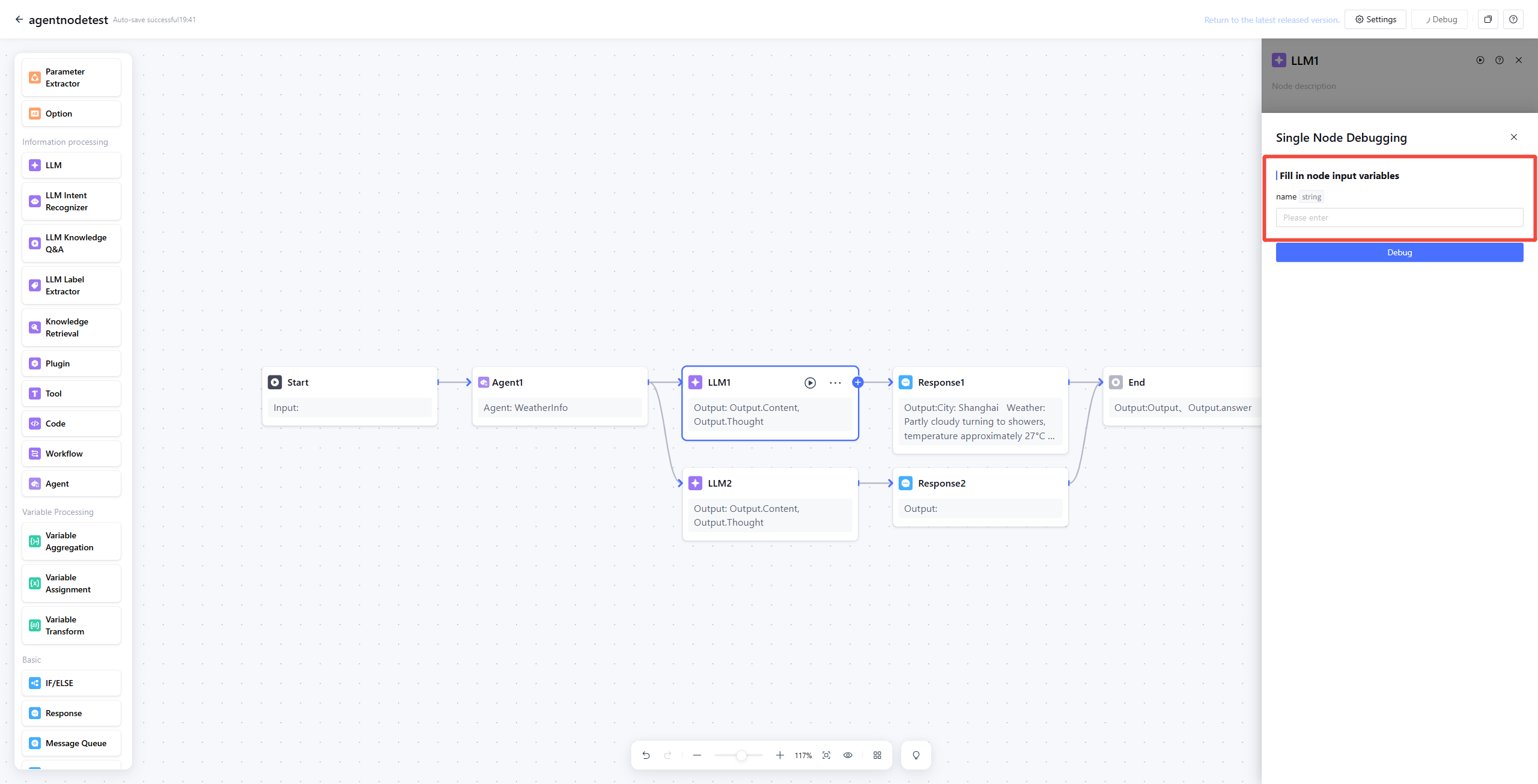 During workflow configuration, you can debug a single node at any time. Once configured, you can perform end-to-end testing. The Intelligent Agent development platform workflow supports debugging through multi-round dialogue and shows the detailed execution result of each node.