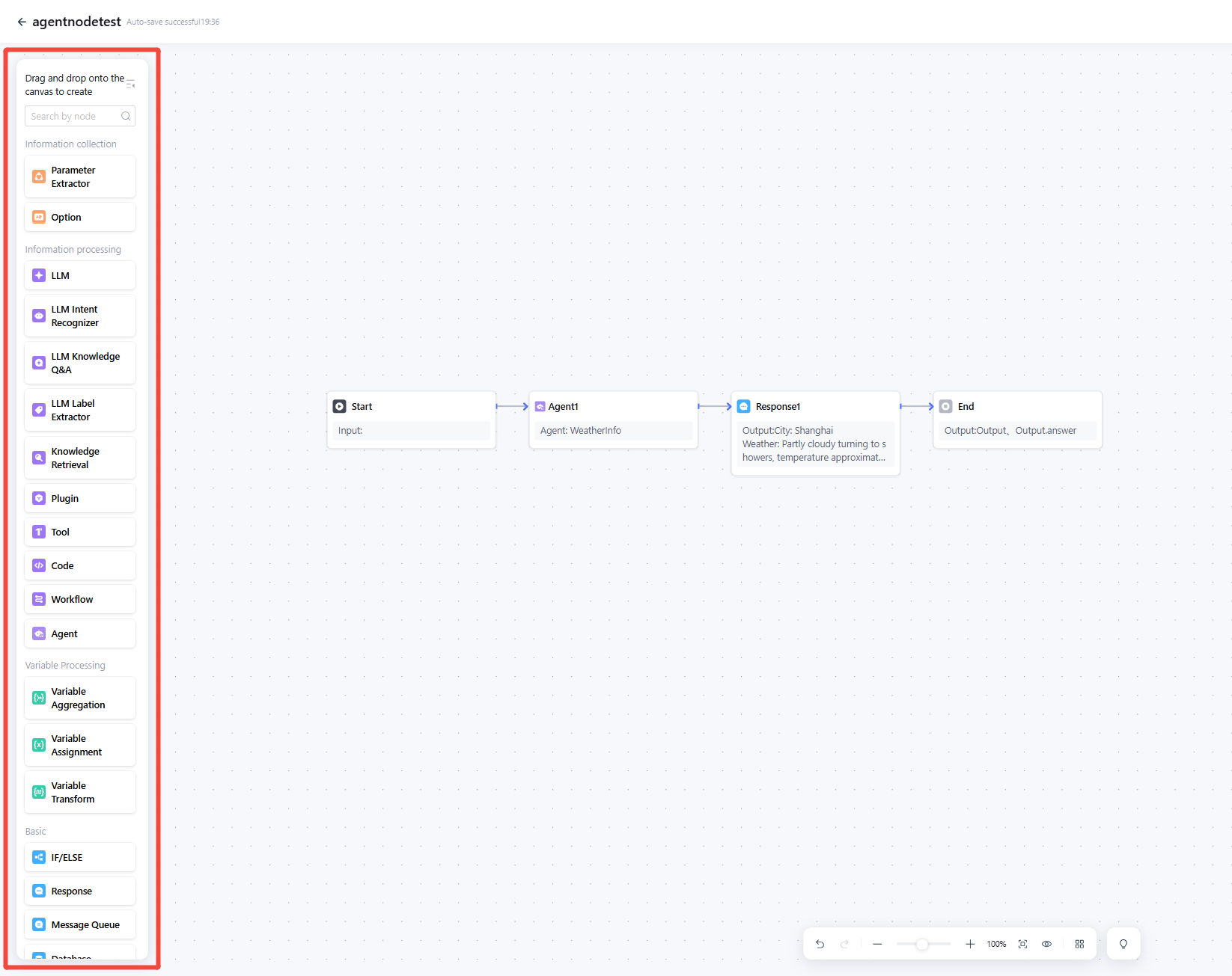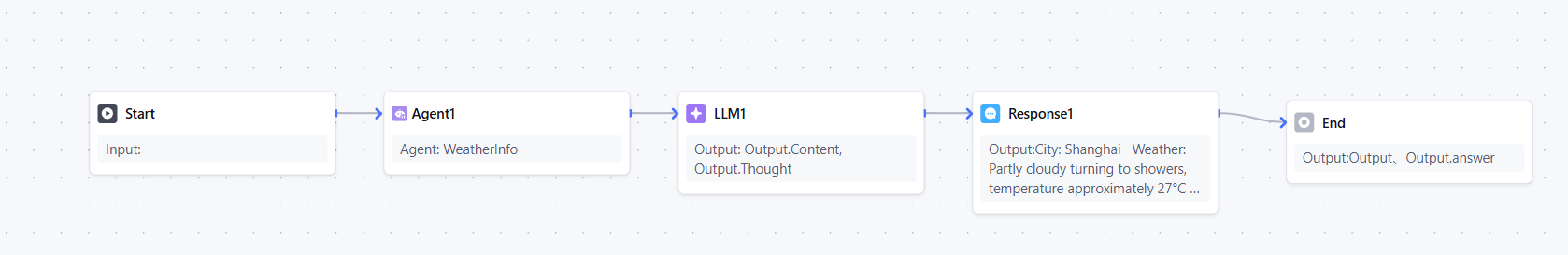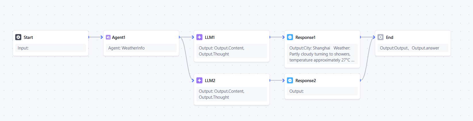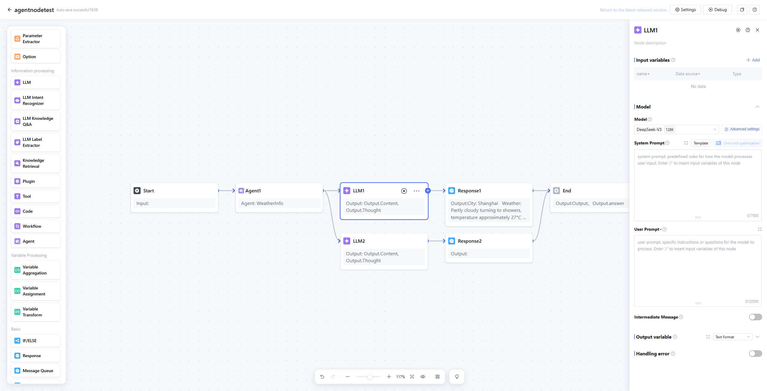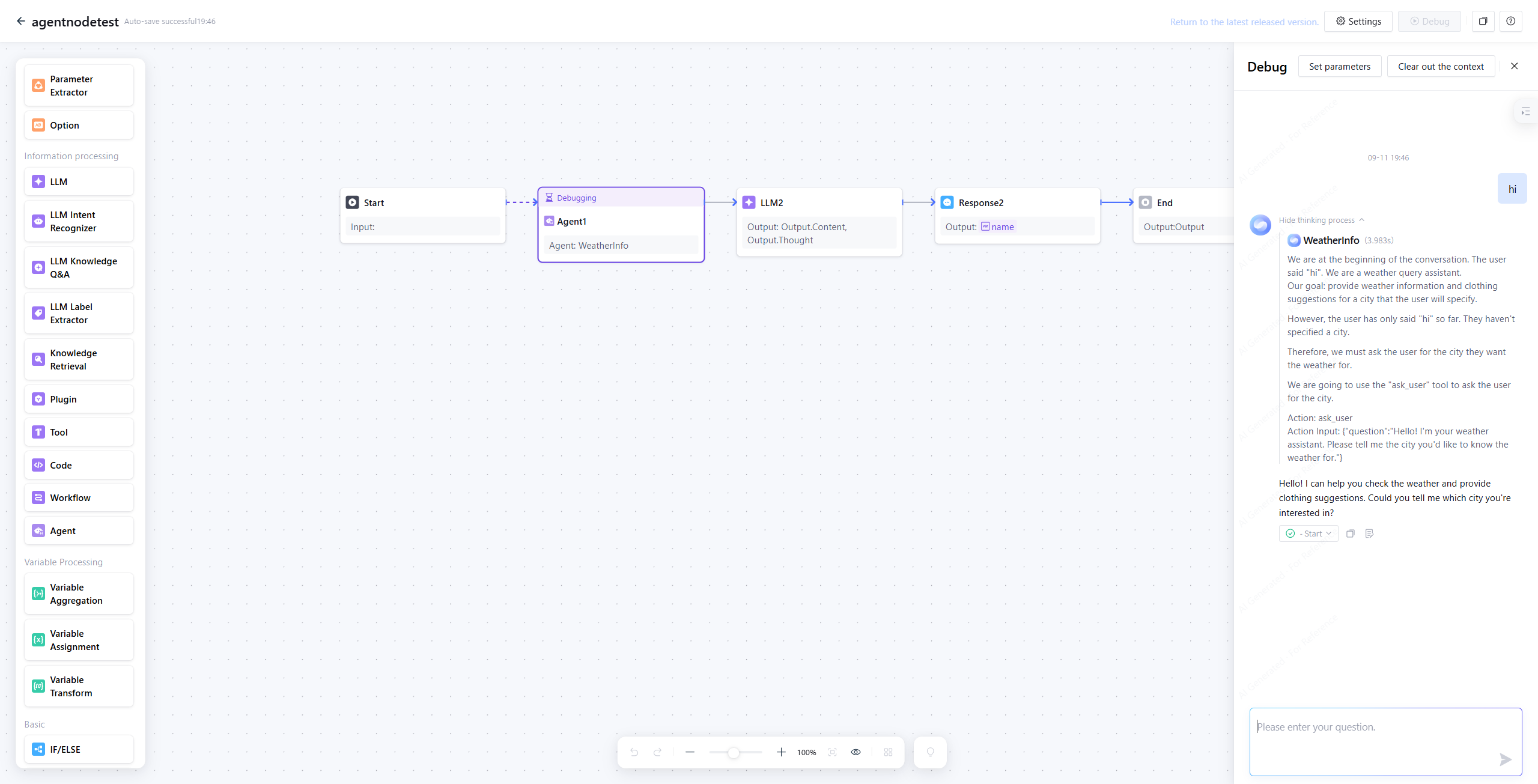 During workflow configuration, you can debug a single node at any time. Once configured, you can perform end-to-end testing. The Intelligent Agent development platform workflow supports debugging through multi-round dialogue and shows the detailed execution result of each node.