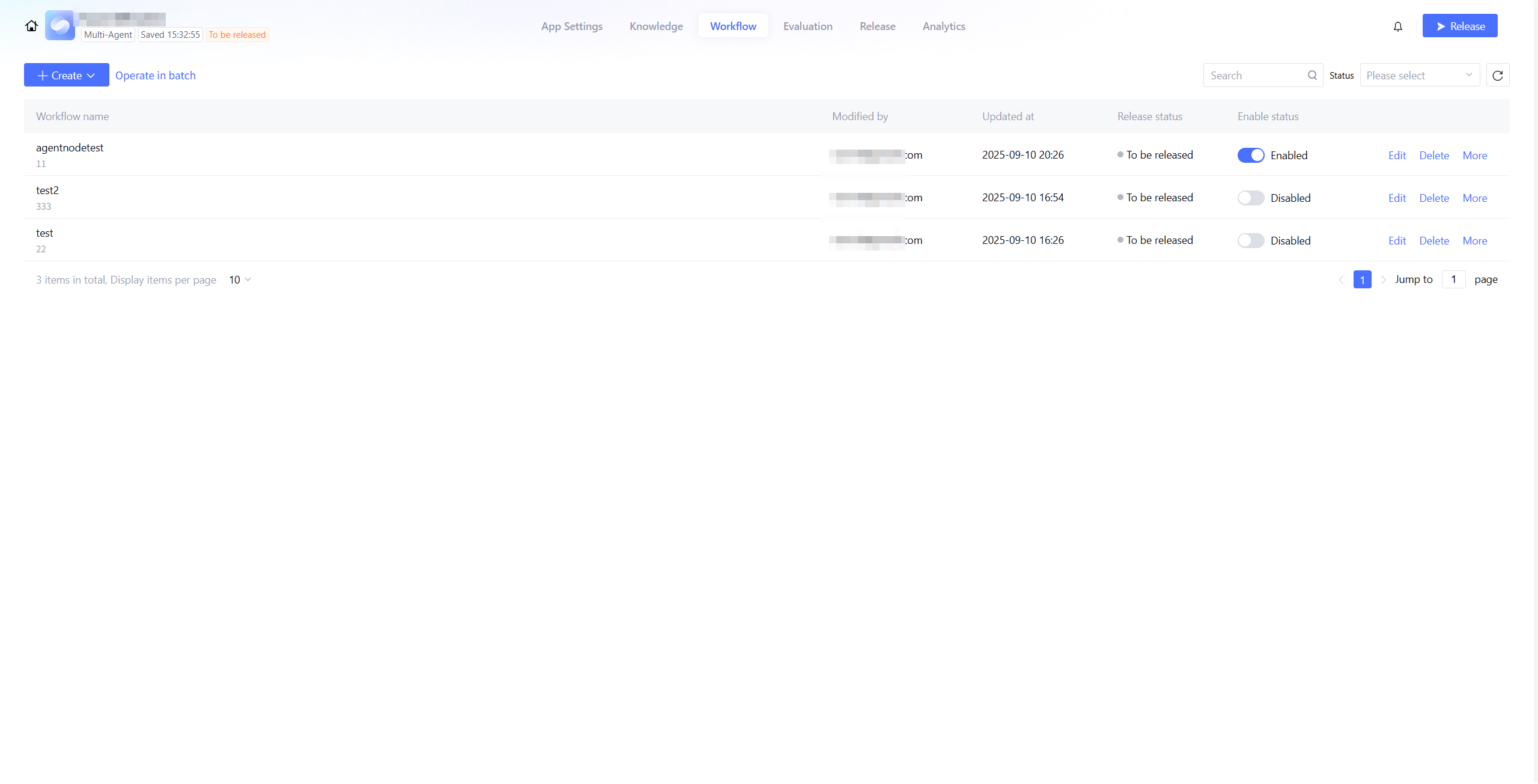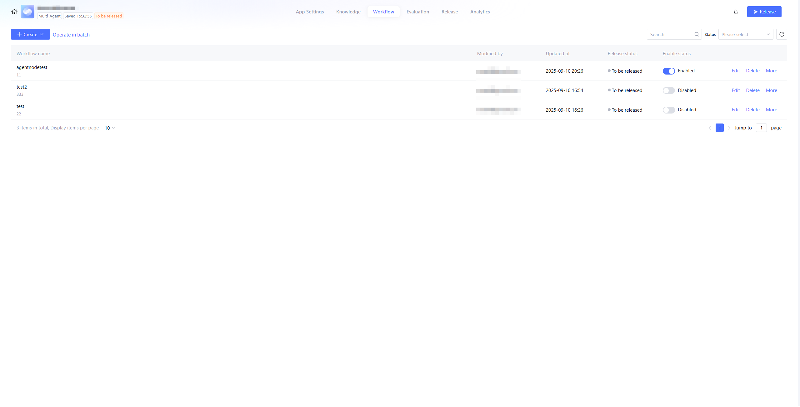 1. After configuring the workflow, return to the flow management page to enable or disable it.