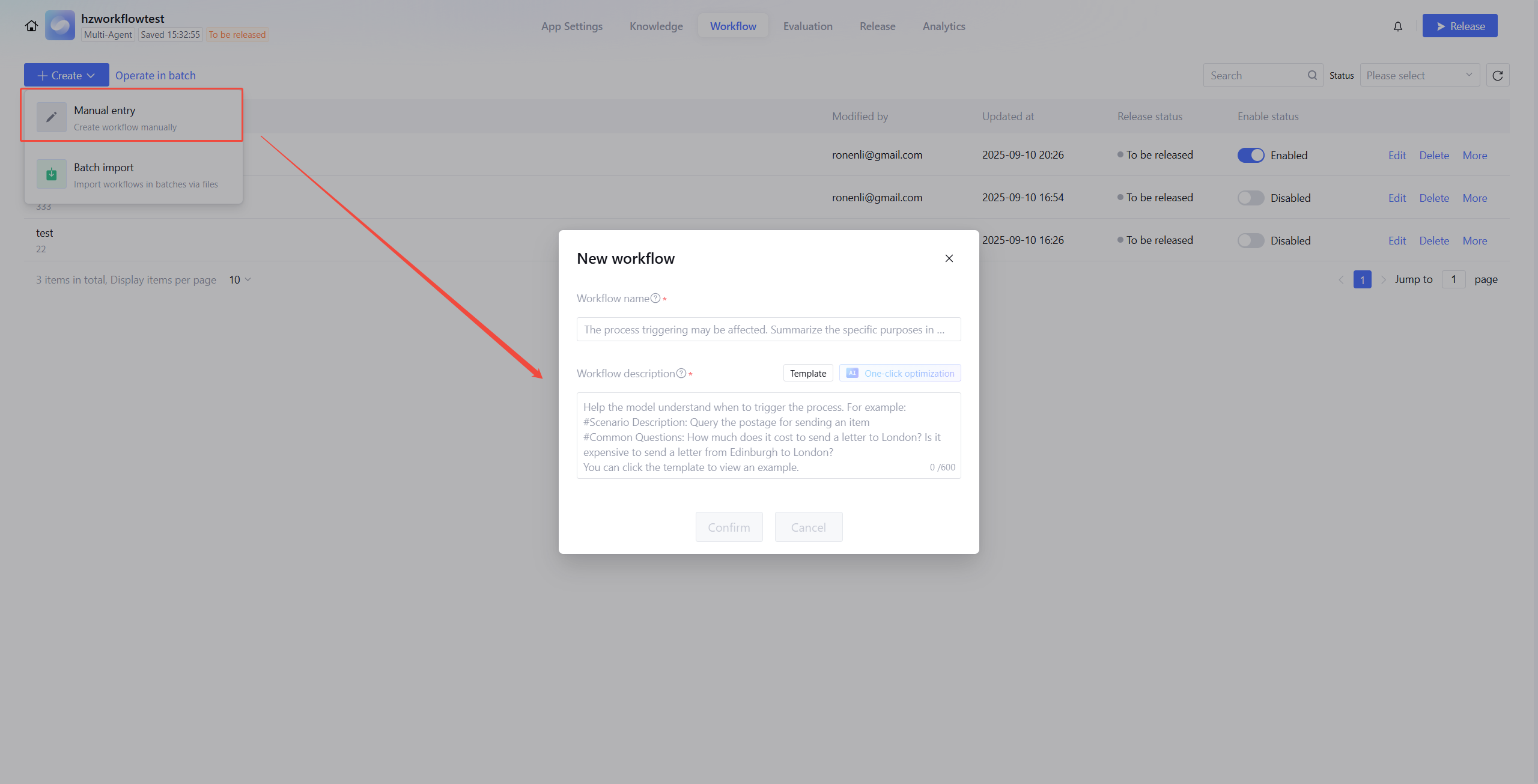 1.1 Click Create > Manual Entry, fill in the workflow name and workflow description.