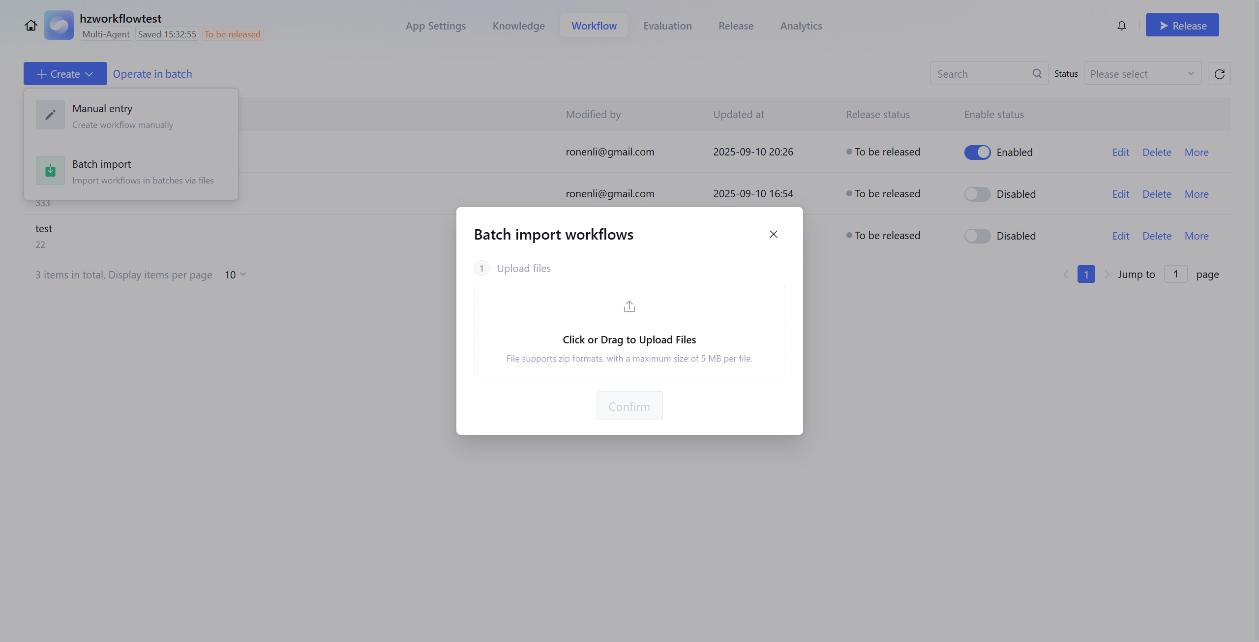 The Intelligent Agent development platform supports two ways to create workflows: "manual entry" and "batch import". "Manual entry" supports configuring workflows from scratch, while "batch import" supports importing compressed package files to replicate workflows across applications and share workflows among teams.