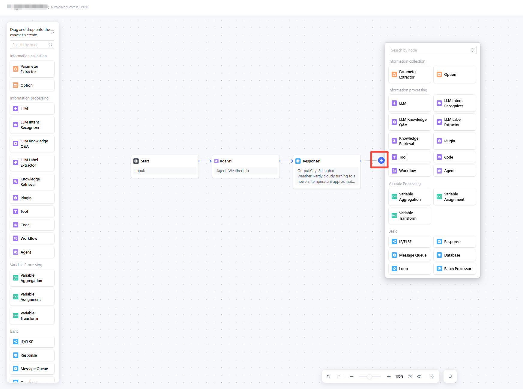 3. Connect nodes on the canvas according to your business requirements. The connection method between nodes can be divided into serial and parallel connection. The input variable of a node can refer to the output variables of ALL ancestor nodes.