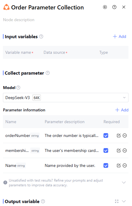 Data source | The data source of this variable supports two options: "refer" and "input". "Refer" allows selecting output variables from all preceding nodes, while "input" enables manually filling in a fixed value. |