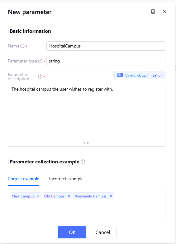 Parameter Description | The description of the parameter helps the model accurately identify and understand it. It is advisable to fill in as "concept definition + value requirement". You can use AI for one-click optimization to adjust the content. Mandatory. |