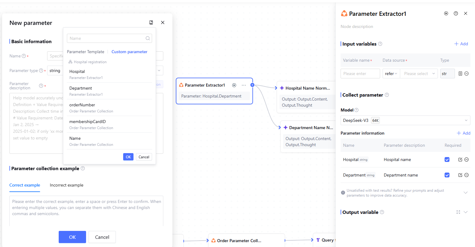 If you have special requirements for the parameter extraction process, you can configure the prompt in "collect parameter" to guide the LLM to generate appropriate counter-question clarification responses. Typical scenarios include: