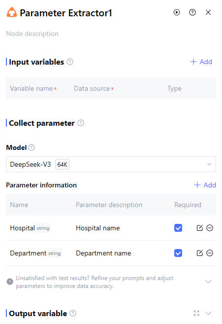 The parameter extractor node belongs to the Information Collection Node. It collects parameters through multi-round dialogue with the user. Parameter information must be defined based on your business scenario. Workflow execution will be interrupted here for interaction with the user until all required parameters are collected.