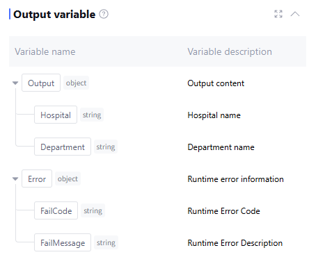The output variable processed by this node defaults to the configured parameters for user, as well as runtime Error information (data type is object, this field is empty during normal operation). Manually add is not supported.