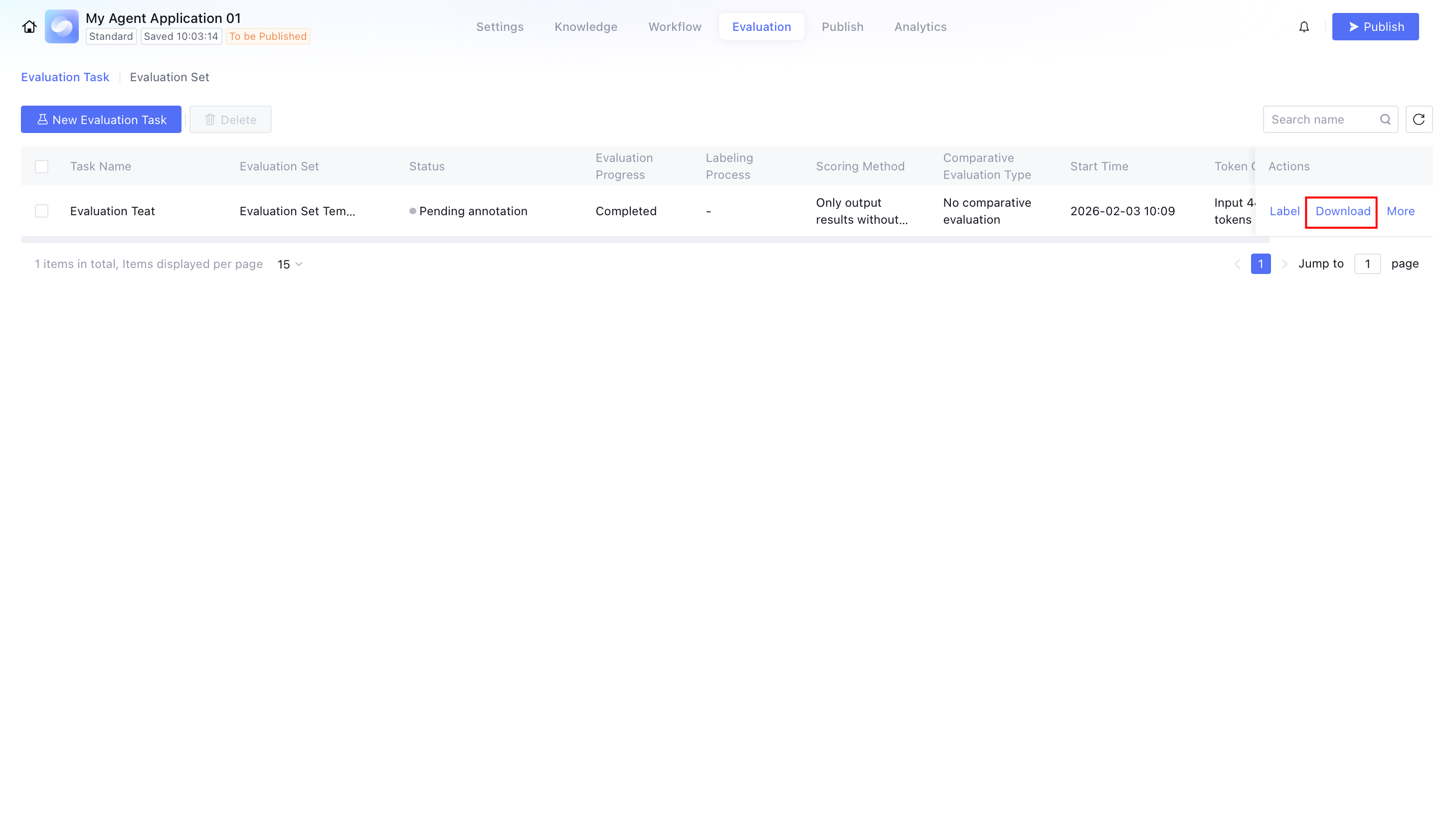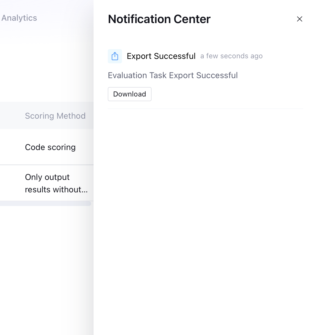 To see the complete evaluation result and records, click the download button on the right of the evaluation task to trigger the download task.