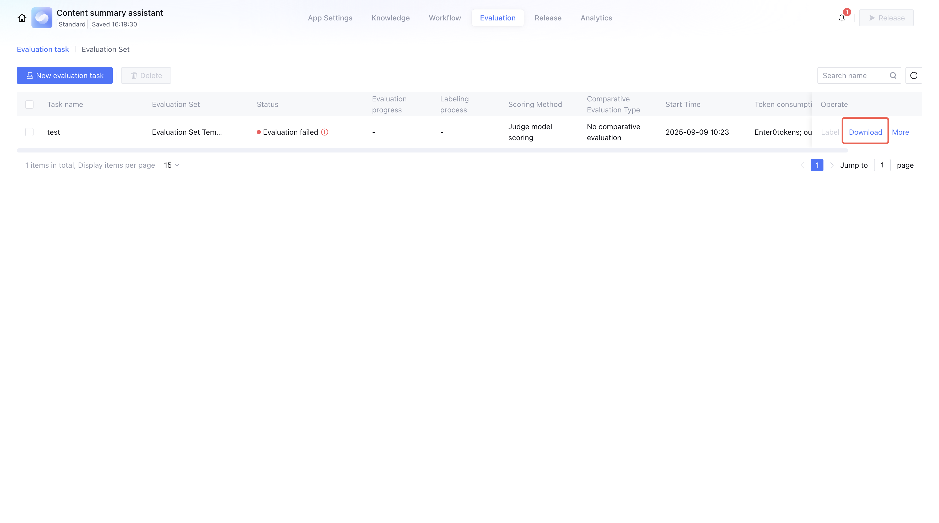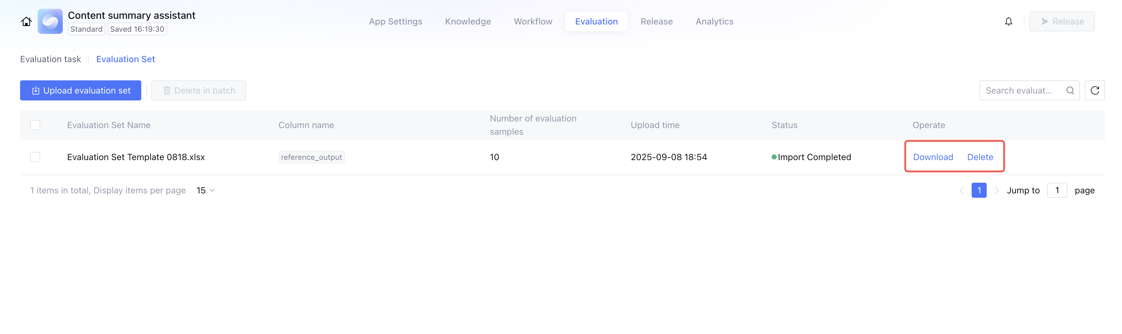 On the evaluation set management page, you can manage uploaded sets, including downloading and deleting them.