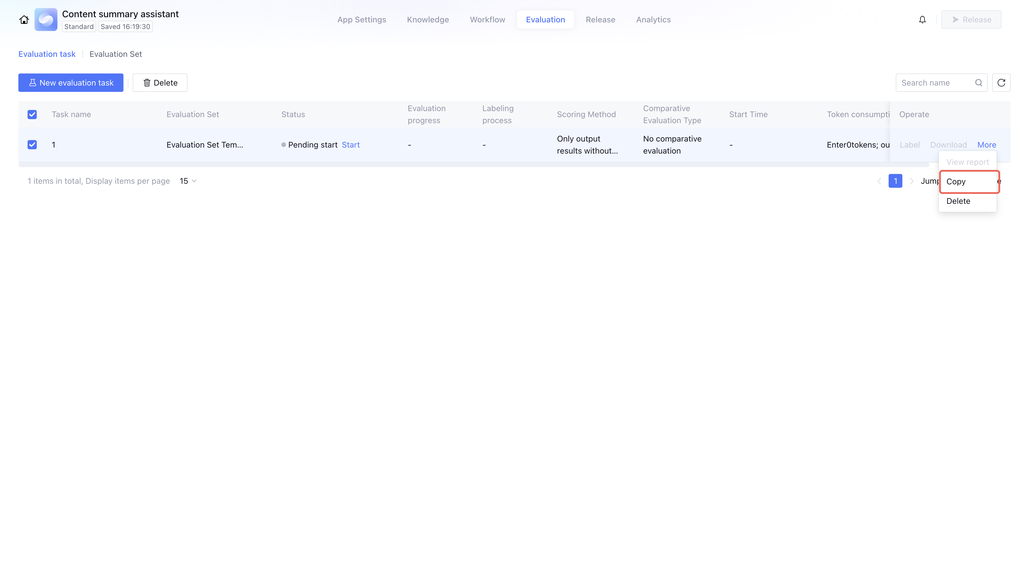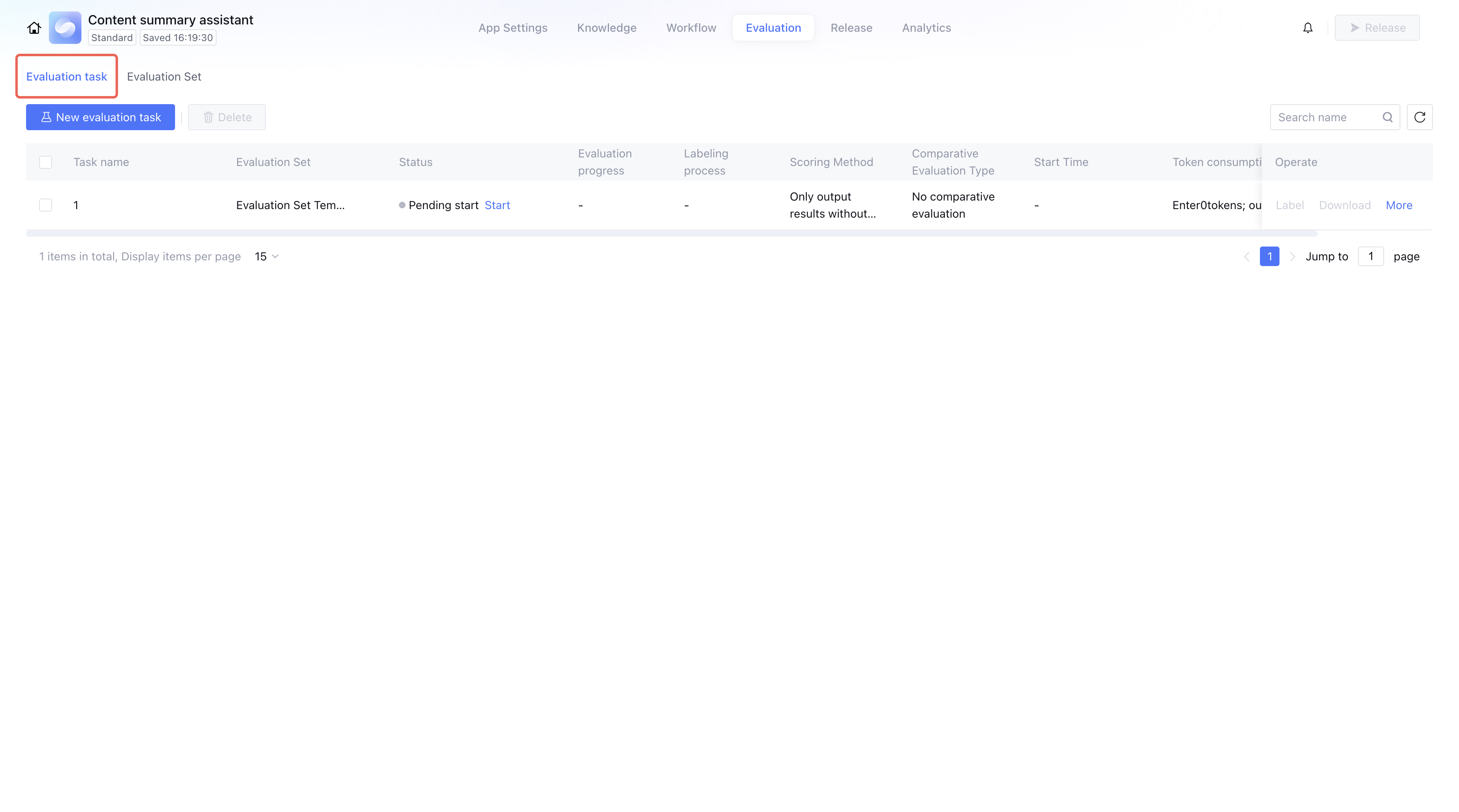 An evaluation task is the core step in executing application evaluation. It allows users to choose evaluation methods, start tasks, and manage the process.
