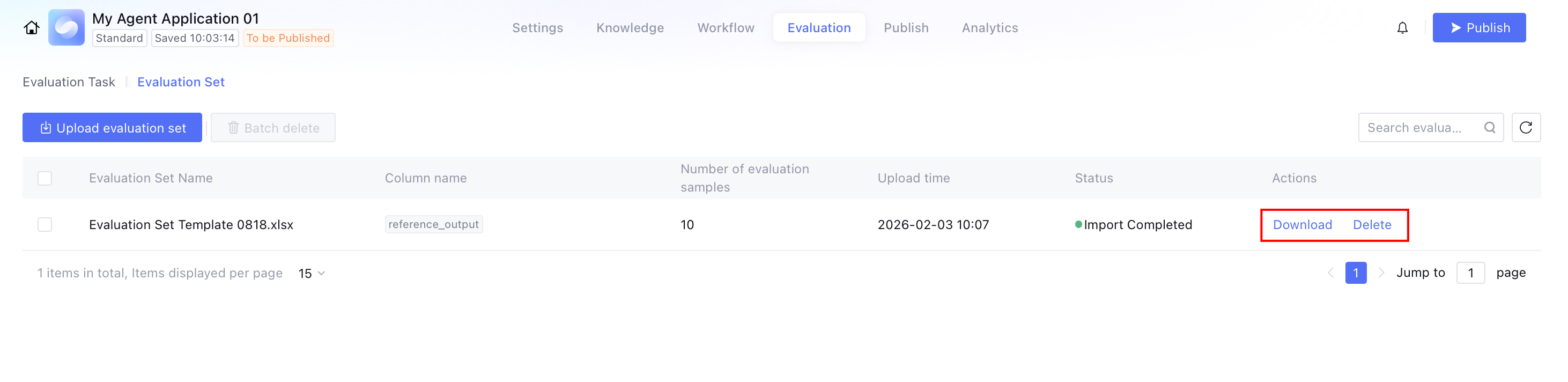 On the evaluation set management page, you can manage uploaded evaluation sets, including download and deletion.