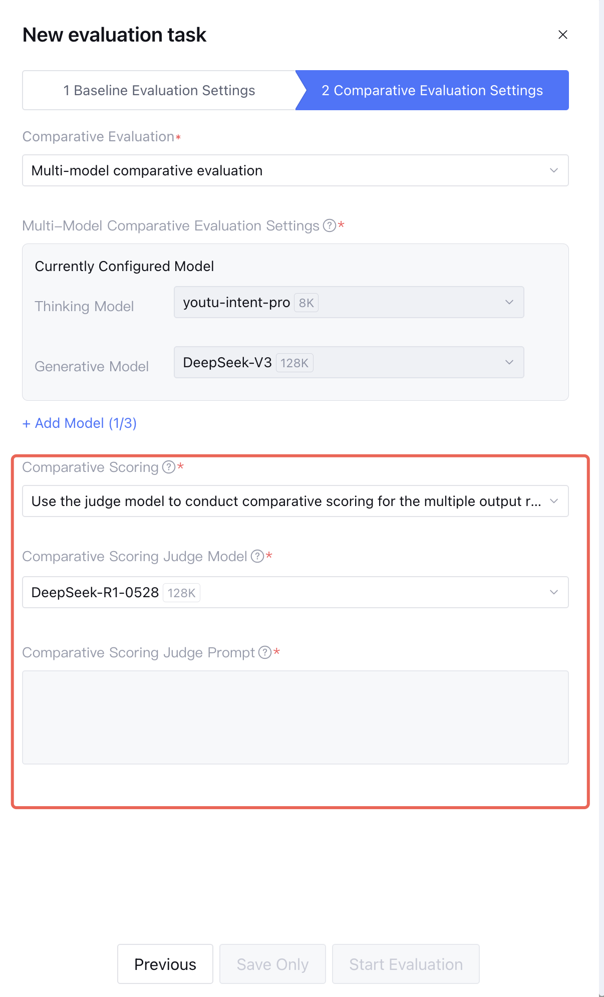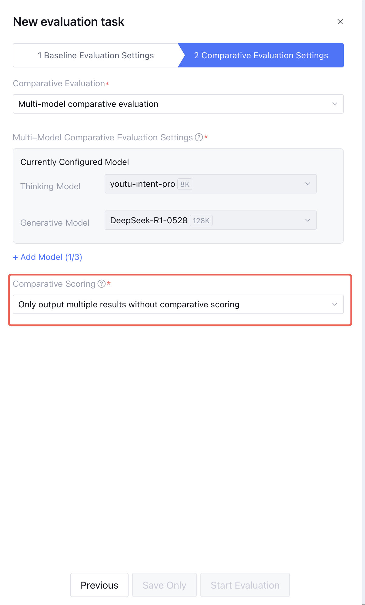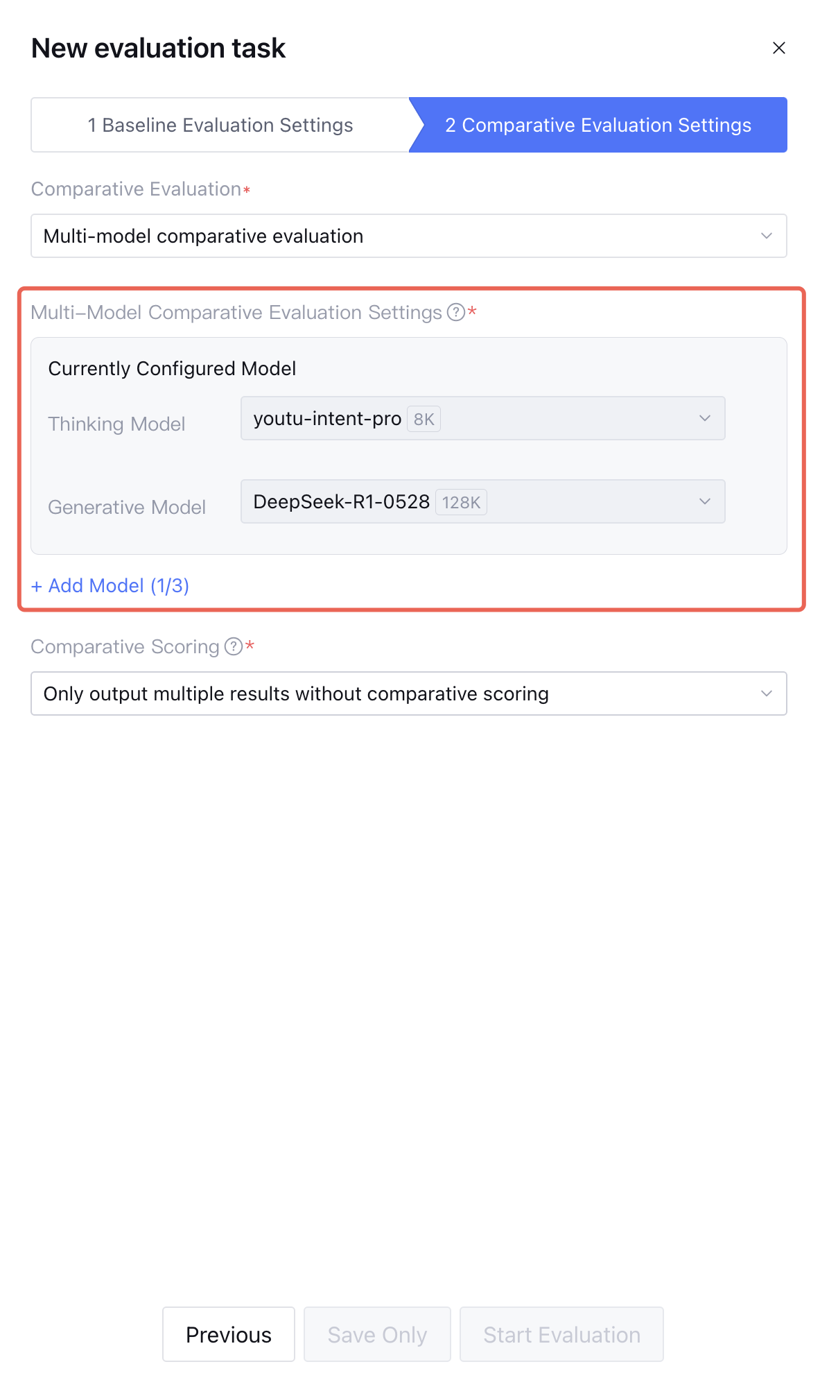 2. Multi-model comparitive evaluation: Add up to 2 comparison models to compare with the configured model. If the same model is selected, the system reports an error.