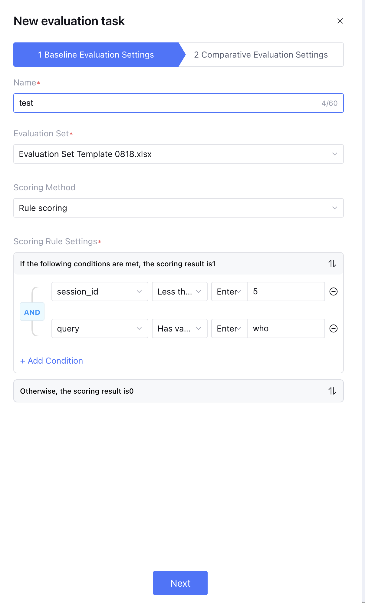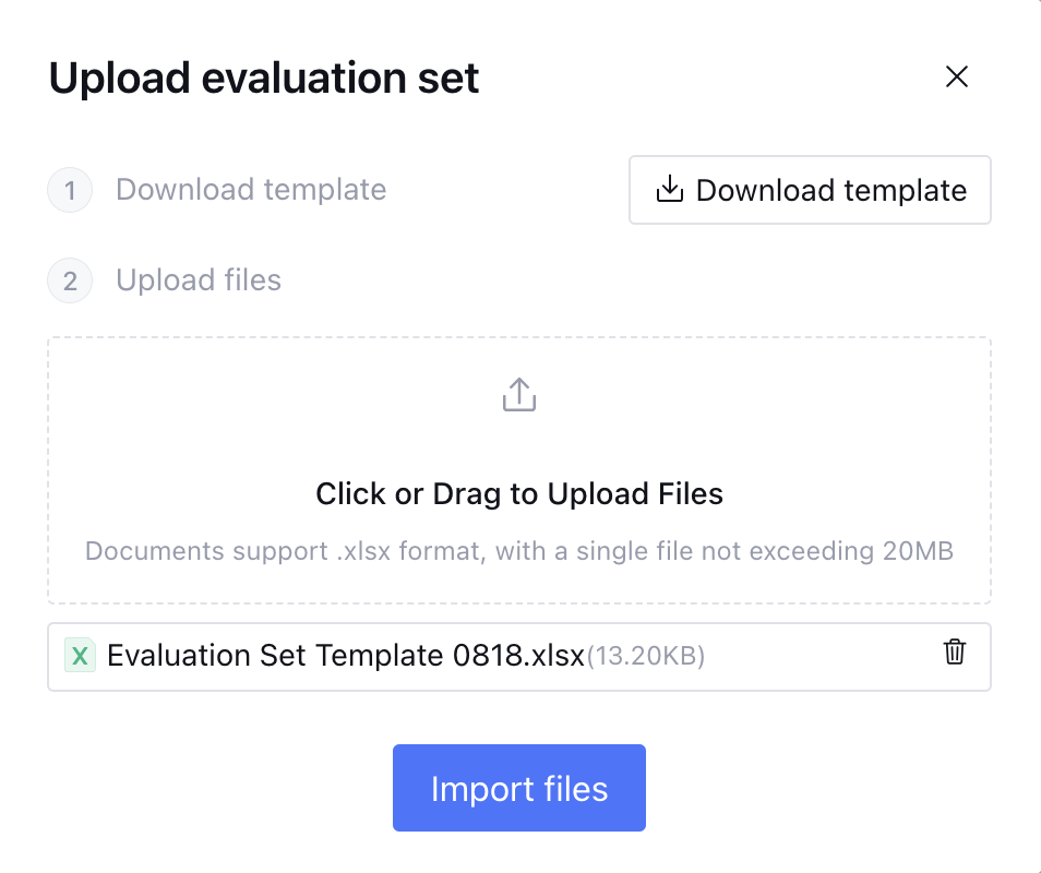 Evaluation Set: Select uploaded evaluation sets (up to 5). Column names must match; otherwise the system will report an error.