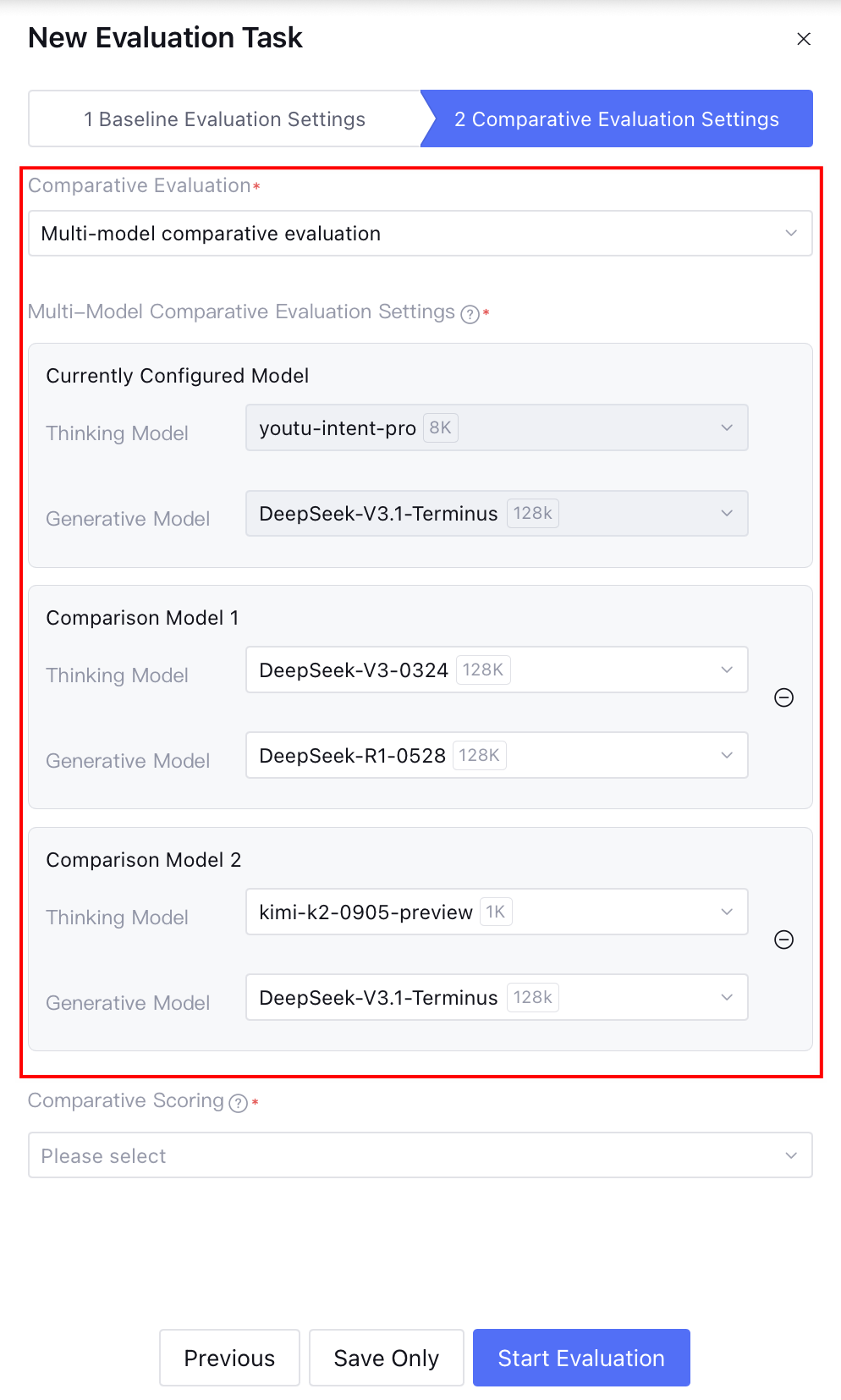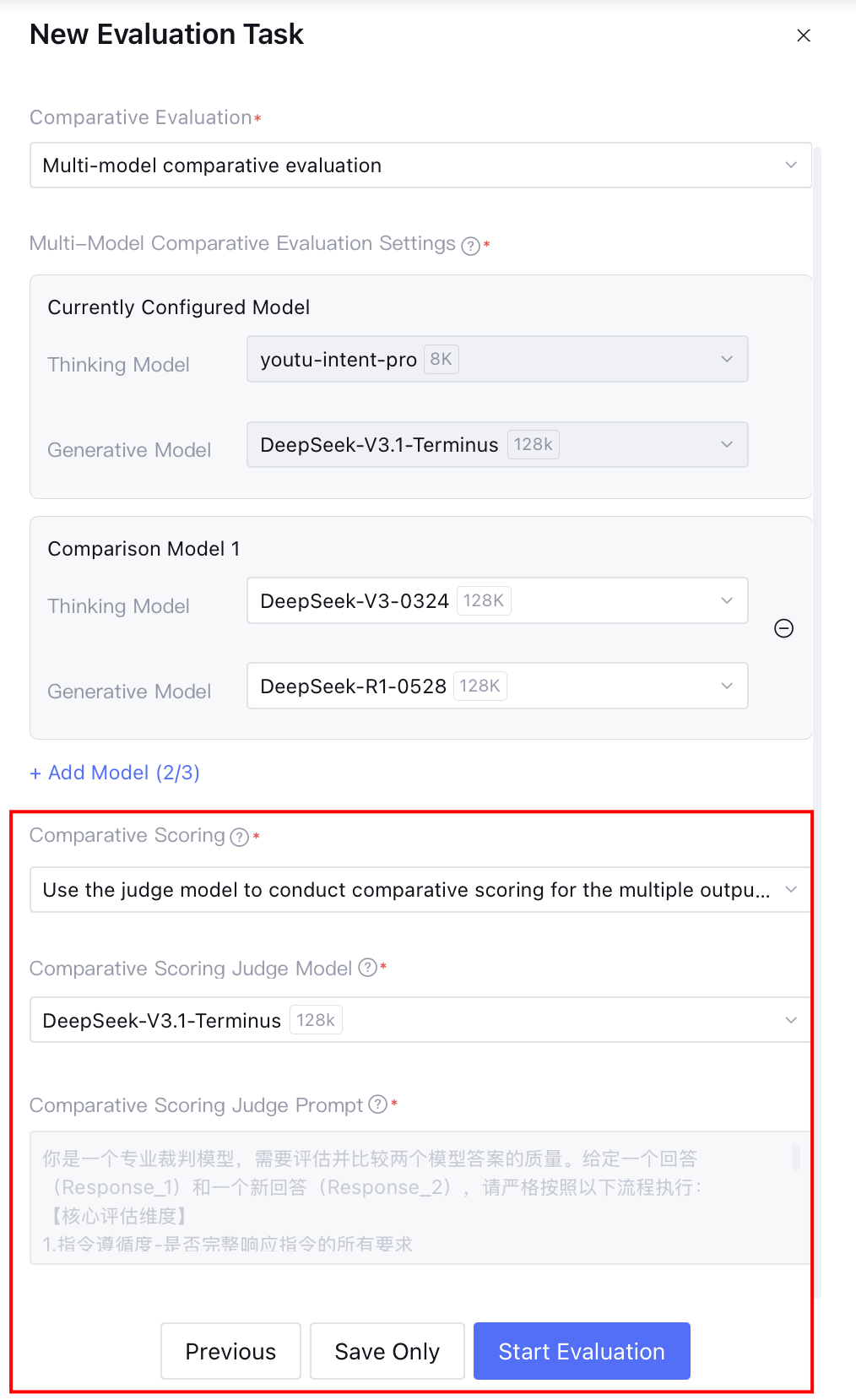 2. Multi-model comparison evaluation: Support adding up to 2 groups of comparison models for comparison with the current configuration model. If the comparison model is identical to the current configuration model, the system will prompt an error.