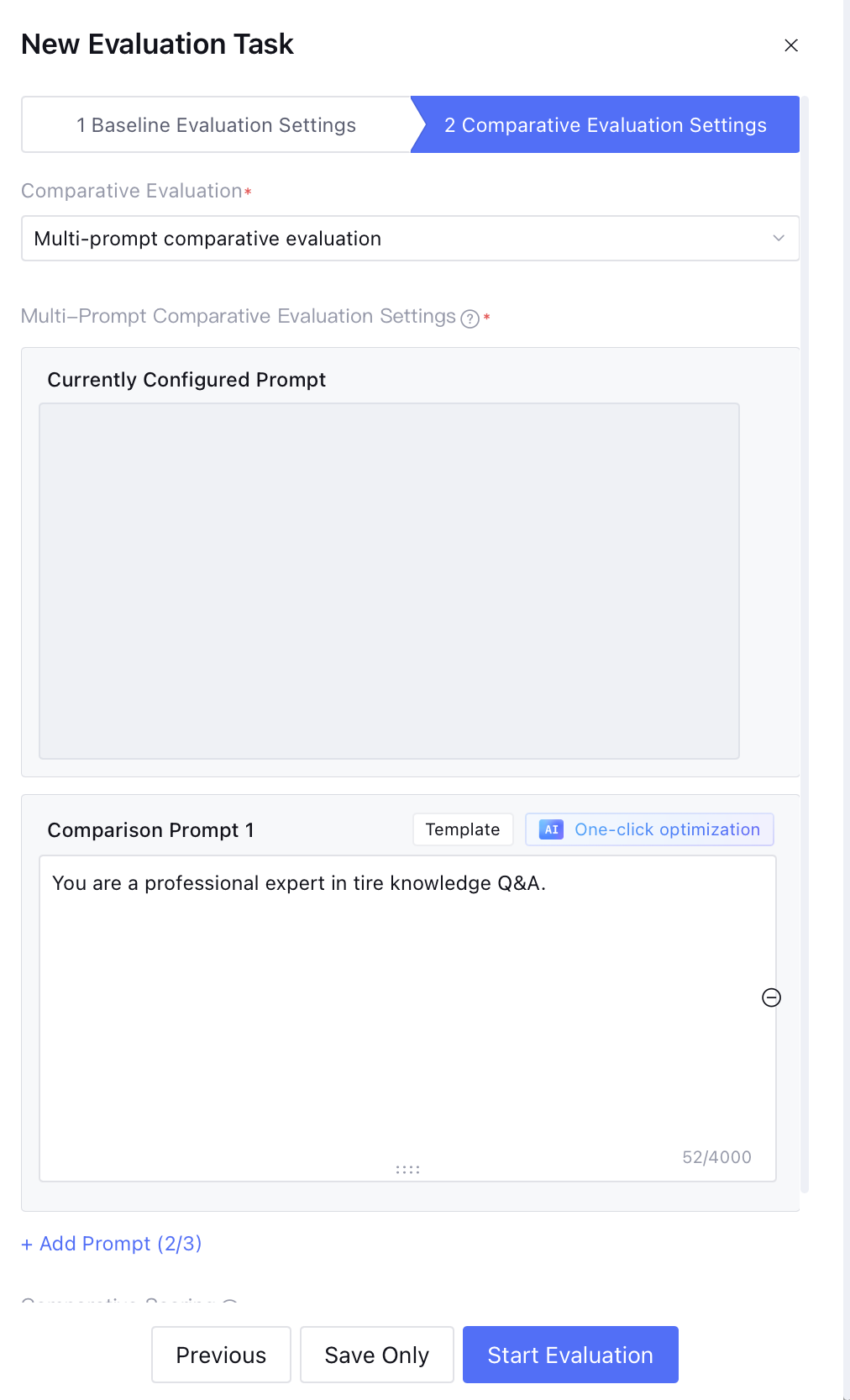 3. Multi-prompt content comparison evaluation: Support adding up to 2 groups of comparison prompt content for comparison with the current configuration prompt content. If the comparison prompt content is identical to the current prompt content, the system will prompt an error.