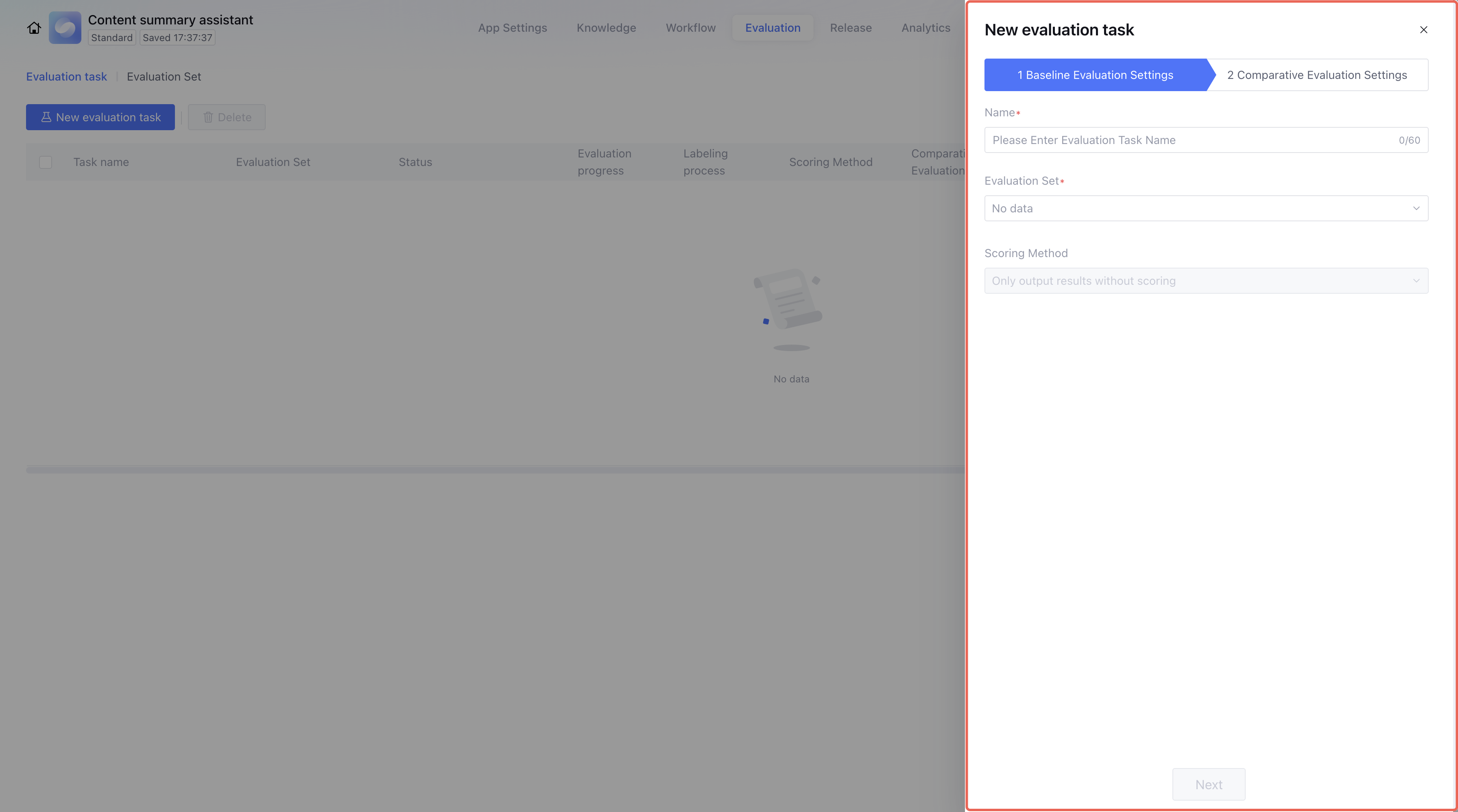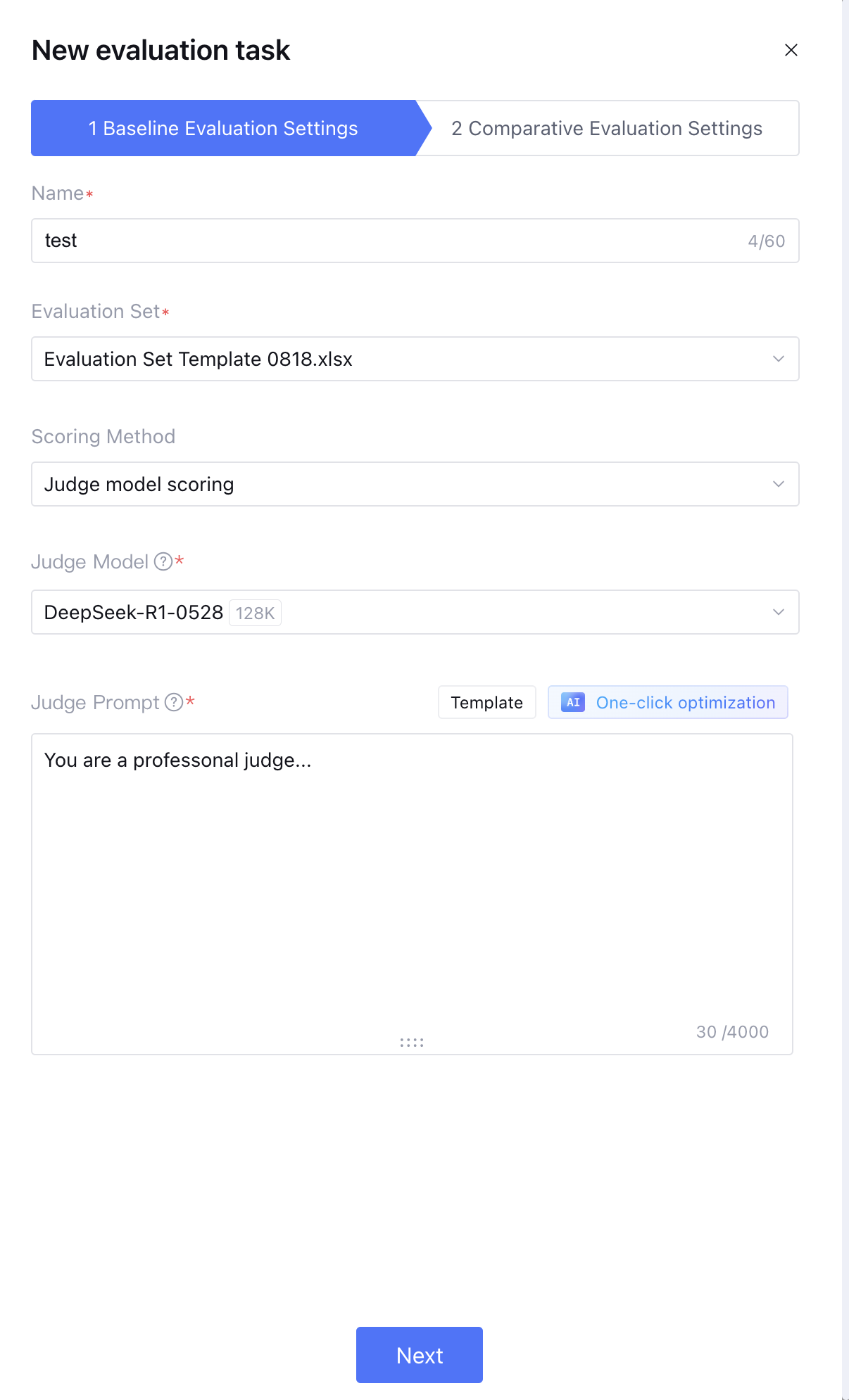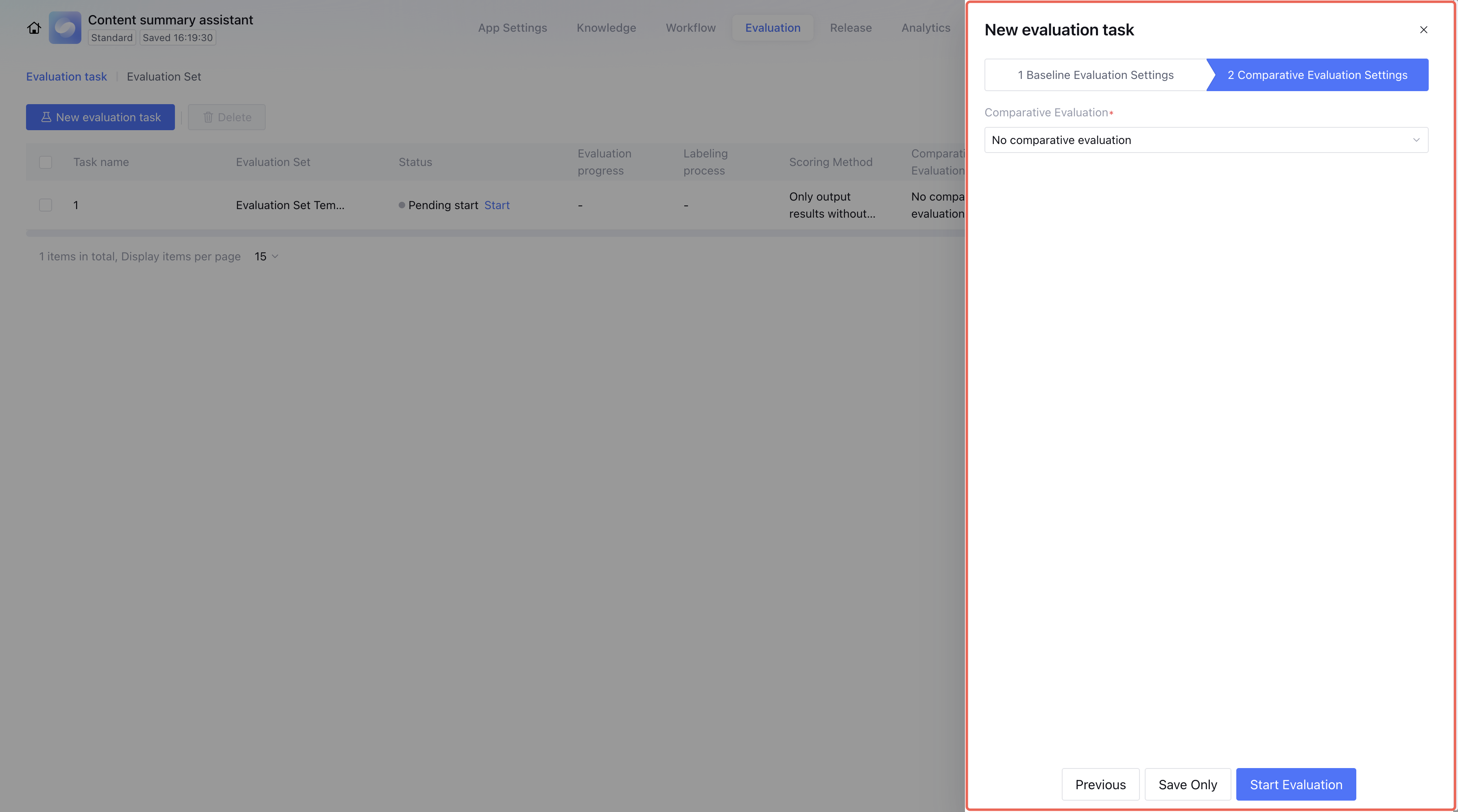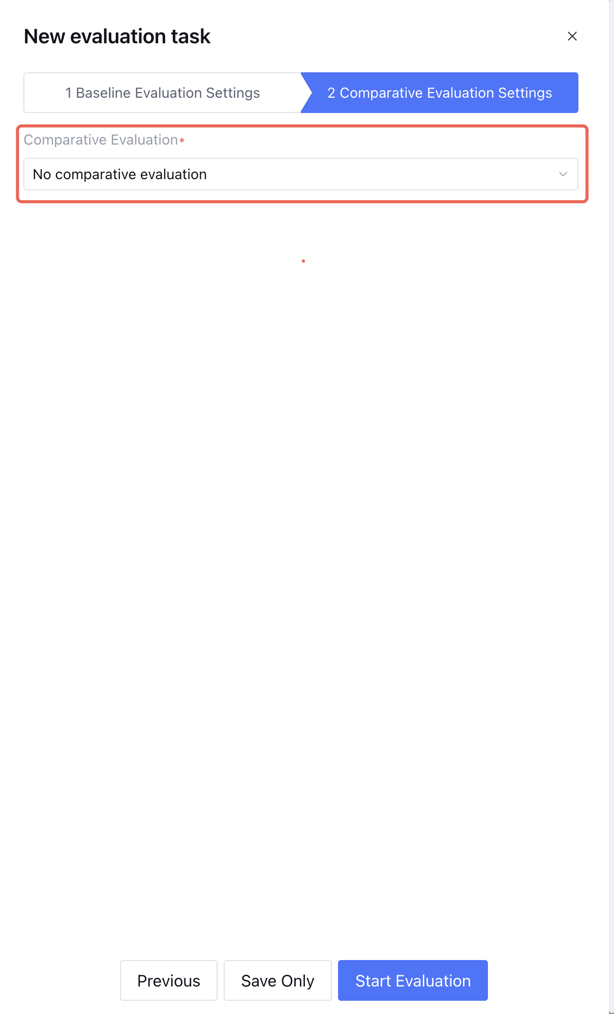 Creating an evaluation task involves two steps: Benchmark Evaluation Configuration and Comparison Evaluation Configuration, which will be explained in detail in the following text.