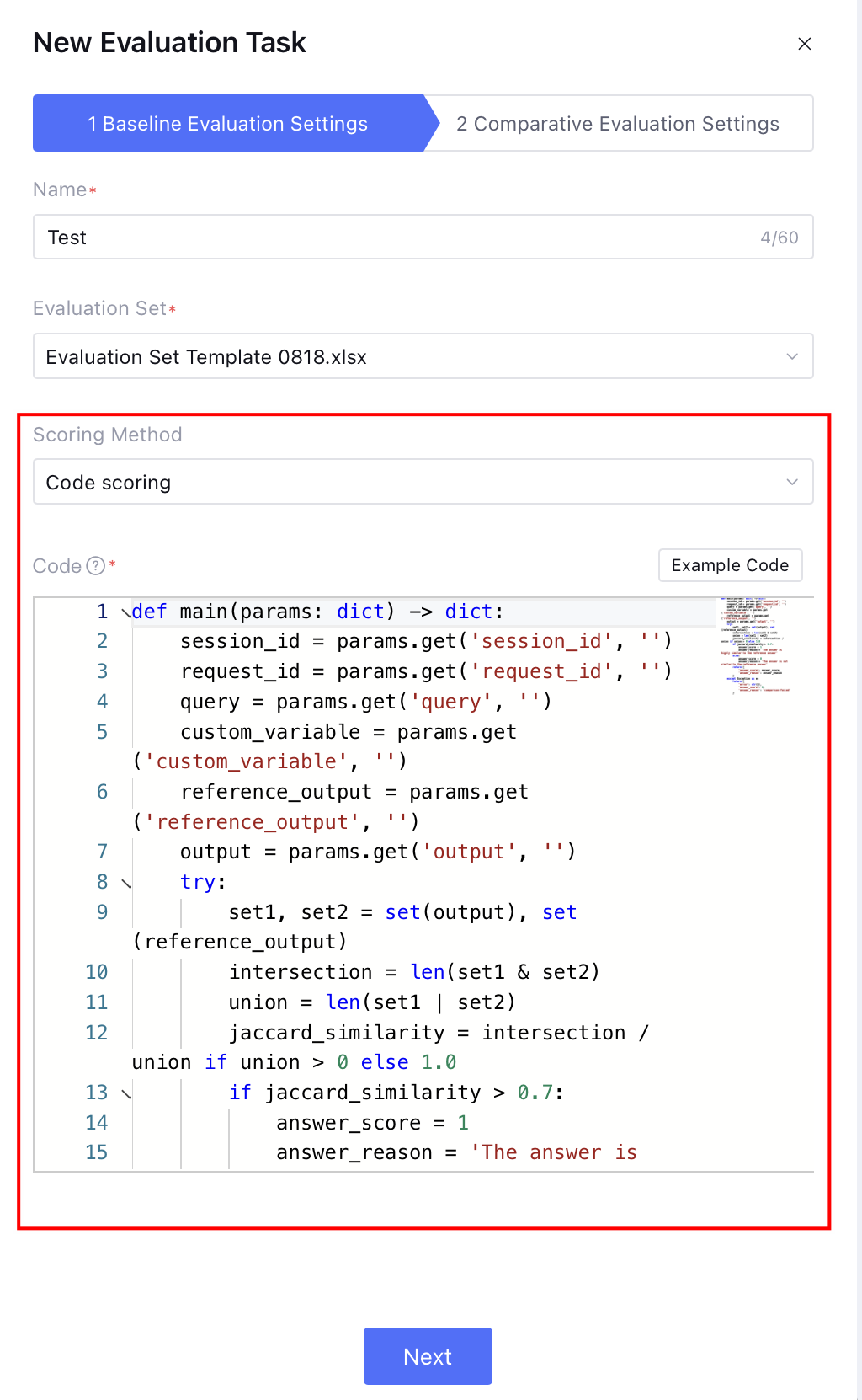 3. Code scoring: Score the output result by writing code. Currently supports Python language. You can make a direct reference to query, preset columns, and custom columns in the evaluation set.
